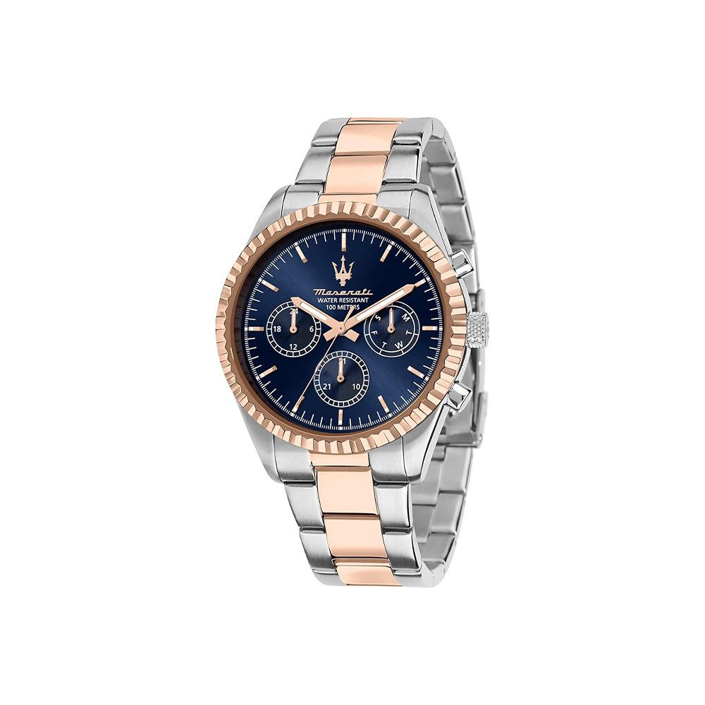 Die Maserati Competizione (Artikelnummer: R8853100040) ist eine sportliche und zugleich elegante Herrenuhr, die mit hochwertigen Materialien und präziser Verarbeitung überzeugt. Ihr 43-mm-Edelstahlgehäuse mit geriffelter Lünette umschließt ein stilvolles blaues Zifferblatt mit Sonnenschliff. Dank des robusten Mineralglases und der Wasserdichtigkeit von 10 Bar ist sie ein zuverlässiger Begleiter für jede Gelegenheit. Das Quarzwerk mit Multifunktionsfunktion sorgt für höchste Präzision.