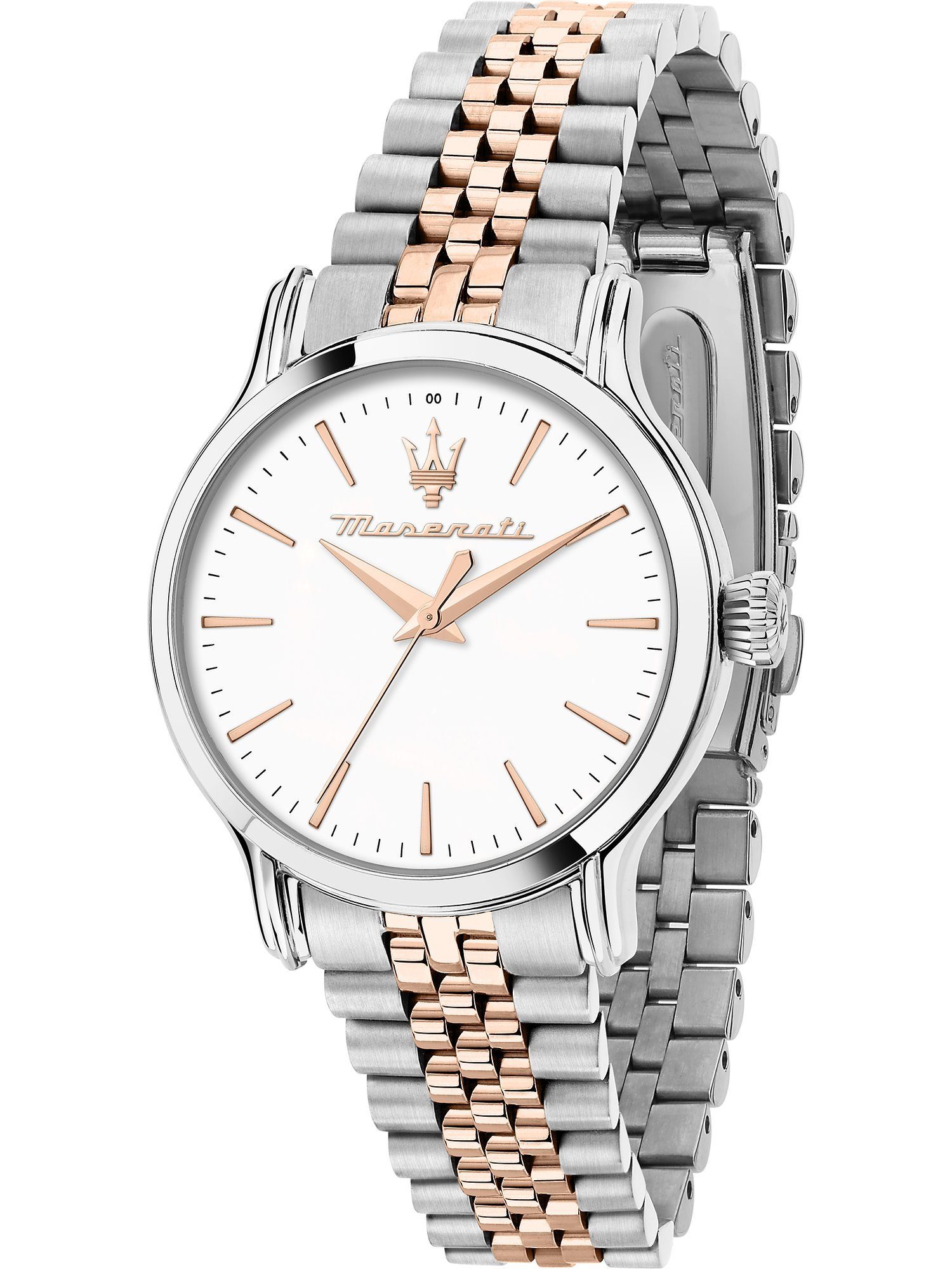 Ein Traum in Roségold und Perlmutt mit Diamanten - die Damenuhr Epoca von MASERATI vereint alles, was Frauen lieben! Das teilmattierte Gliederarmband sowie das Gehäuse der Uhr sind aus roségoldenem Edelstahl gefertigt. Das perlmuttfarbene Ziffernblatt sorgt für einen perfekt dazu passenden, edlen Schimmer und in Kombination mit den roségoldenen Zeigern für optimale Ablesbarkeit. Besonderer Clou: An der Stelle von Strichindizes hat MASERATI elf kleine, funkelnde weiße Diamanten eingesetzt. Lediglich auf der Position der 12 prangt statt eines Diamanten das berühmte Dreizack-Logo. Ganz klar: Diese Uhr veredelt all deine Outfits!