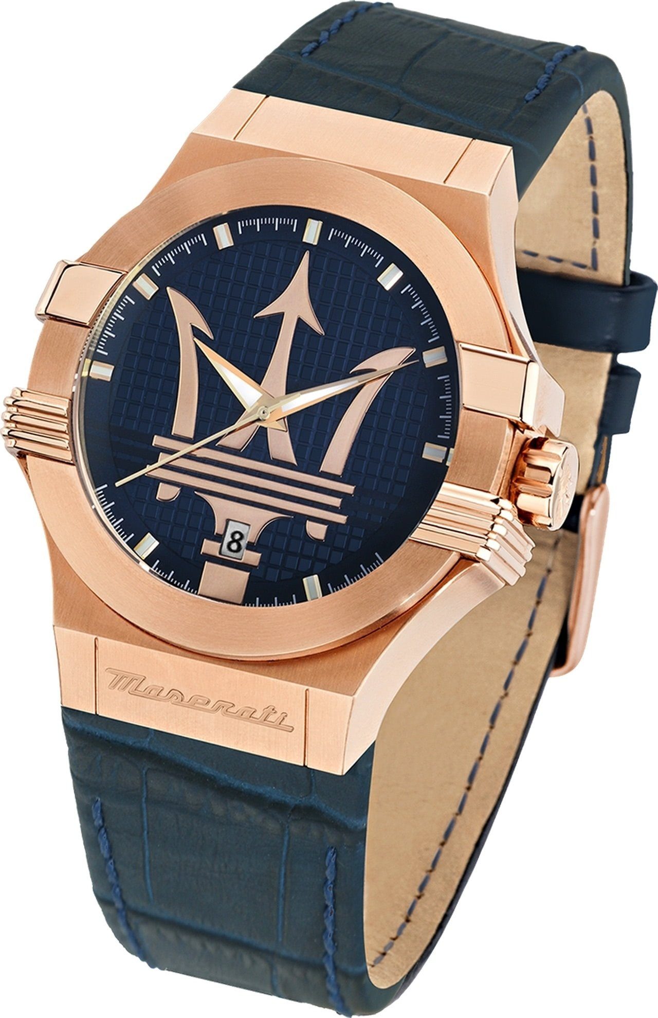 Die Fashion Uhr der Marke Maserati hat ein schönes Armband aus Leder in blau mit Faltschließe. Eine Uhr aus der Maserati POTENZA Kollektion für Herren in der Gehäusefarbe roségold mit Armbanduhr. Die Analoguhr mit Mineralglas hat ein Zifferblatt in der Farbe blau. Die Form der Uhr ist rund und das Gehäuse ist groß ca. 40mm.