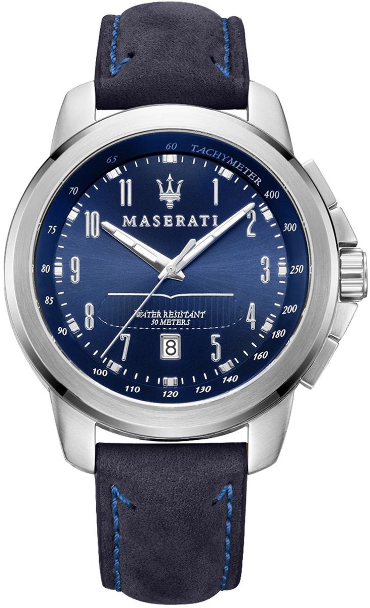 Die Sport Uhr der Marke Maserati hat ein schönes Armband aus Leder in blau mit Dornschließe. Eine Uhr aus der Maserati Successo Kollektion für Herren in der Gehäusefarbe silber mit Quarzwerk. Die Analoguhr mit Mineralglas hat ein Zifferblatt in der Farbe blau. Die Form der Uhr ist rund und das Gehäuse ist groß ca. 44mm.