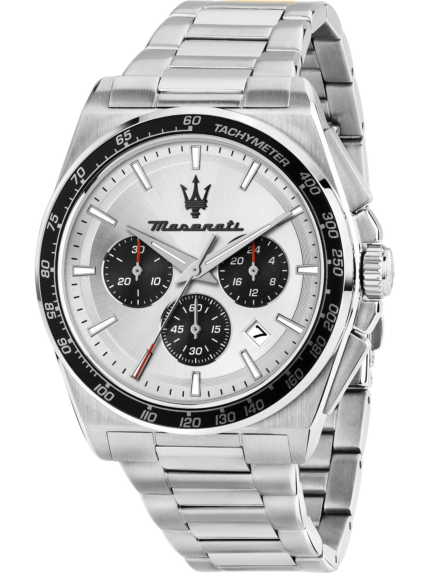 Diese edle Uhrenkollektion ist die ideale Kombination aus zeitloser Eleganz, technischer Perfektion und sportlichem Design. Die Marke mit dem Dreizack verbindet italienischen Stil mit klaren Linien und kraftvollen Formen und dem sportiven Design der Luxus-Automarke. So entstehen detailreiche und markante Zeitmesser, die nicht nur Motorsportbegeisterte überzeugen und sich wunderbar zu unterschiedlichen Looks kombinieren lassen. Für Herren, die in Sachen Stil und Qualität keine Abstriche machen möchten, ist die Maserati Velocita die optimale Wahl. Dieser sportive Chronograph kombiniert ein robustes Edelstahlgehäuse mit einem sportlichen Edelstahlband. Das Armband und das Ziffernblatt sind beide in Silber gehalten, dazu ist die Maserati Velocita mit einem zweifarbigen Gehäuse versehen. Präzision, die begeistert Das runde Gehäuse wirkt stilsicher und edel. Geschützt wird das Ziffernblatt von einem robusten Mineralglas. Die markanten Hilfsziffernblätter fügen sich perfekt in den sportlich-dynamischen Look des Chronographen ein. Das silberne Edelstahl-Band verleiht der Uhr eine edle Note und die Faltschließe sorgt für einen sicheren Halt am Handgelenk. Aber auch die inneren Werte dieser Maserati-Uhr sind absolut überzeugend: Nicht nur sorgt ein hochwertiges und wartungsarmes Quarz-Werk von Miyota für Präzision, sondern die Wasserdichte bis 10bar macht auch Ausflüge ins Kühle Nass problemlos möglich. Diese Uhr von Maserati erzählt deine Geschichte – ein individuelles Stück, das zu deinem einzigartigen Stil passt.