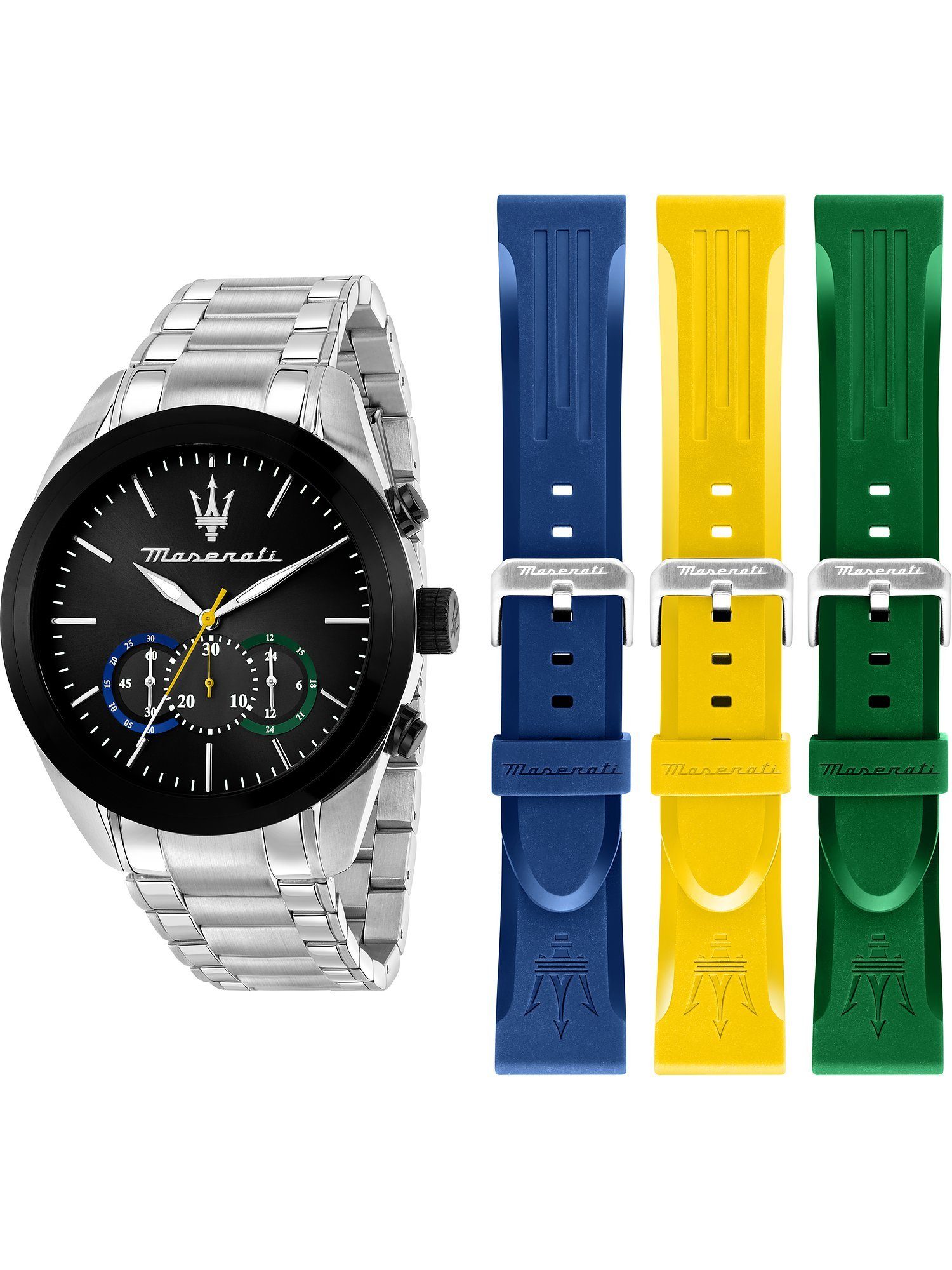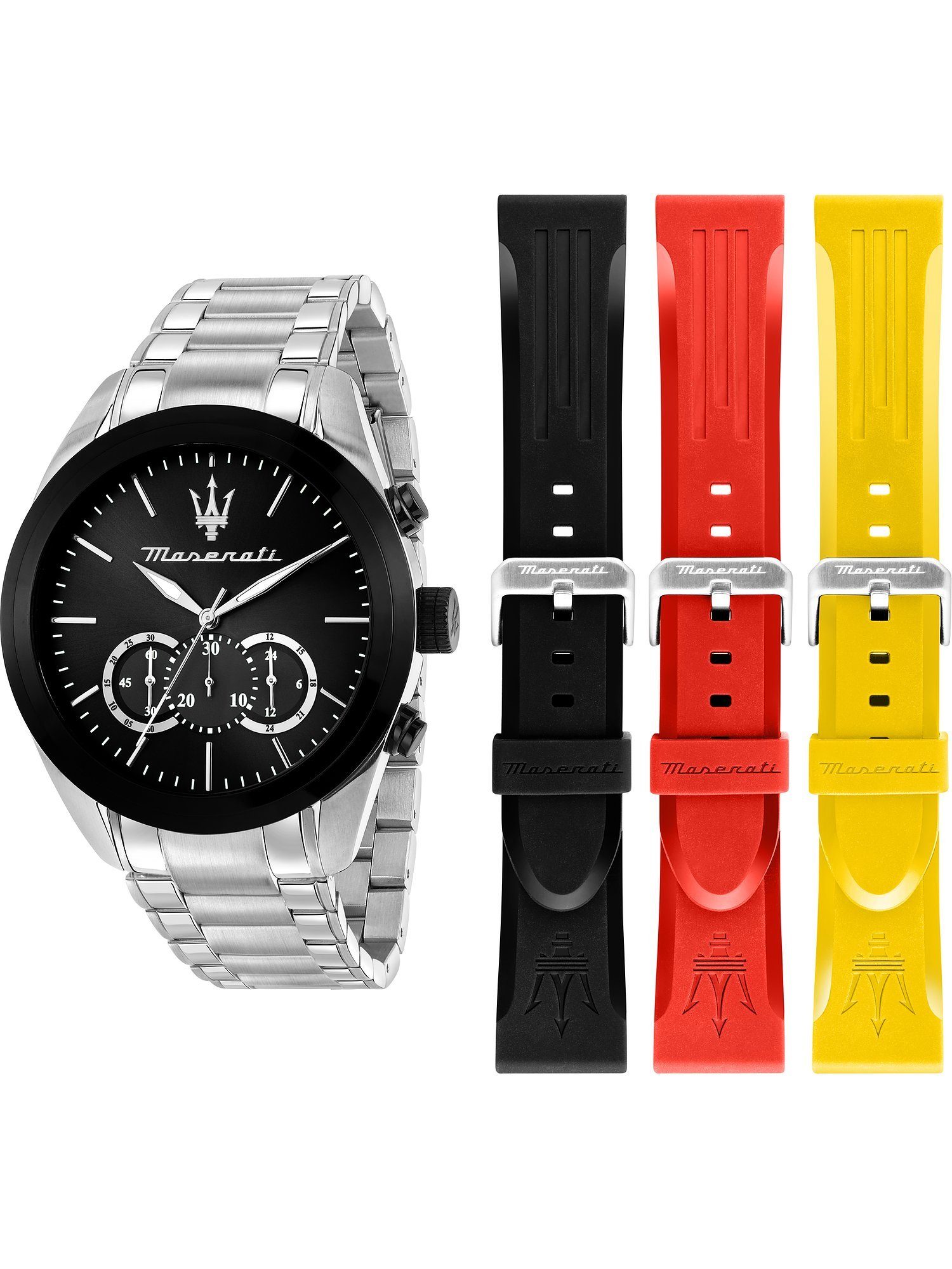 Maseratis hochwertige Uhrenkollektion ist die ideale Kombination aus elegantem und sportlichem Design. Die Marke verbindet italienische Exzellenz mit klaren Linien und kraftvollen Formen und steht als unbestrittenes Emblem für moderne Designs und technische Präzision. Damit du für alle Gelegenheiten gewappnet bist, kommt diese Uhr mit Edelstahl-Gehäuse im Set mit Wechsel-Band. Für noch mehr individuellen Style! Die Traguardo von Maserati kommt in Silber daher, wozu das schwarze Ziffernblatt besonders gut aussieht. Für markante Präsenz am Handgelenk sorgt das runde Gehäuse mit einem Durchmesser von 45 Millimetern. Durch das Quarzwerk ist eine hohe Präzision gewährleistet. Die Orientierung auf dem Ziffernblatt wird durch die Markierungen erleichtert, was zur leichten Ablesbarkeit beiträgt. Durch den Sonnenschliff ist bei jedem Blick auf die Uhr ein faszinierendes Lichtspiel garantiert. Das verwendete Mineralglas bietet eine gute Sicht und ist widerstandsfähig gegen alle Einflüsse, die bei normalem Gebrauch entstehen. Mit einer Wasserdichtigkeit von bis zu 10 Bar ist dieser Zeitmesser allzeit bereit: Du kannst ihn nicht nur beim Duschen tragen, sondern auch beim Schwimmen. Die Faltschließe erleichtert das Anlegen des Armbands und garantiert sowohl einen sicheren Halt als auch einen guten Sitz am Arm. Kurz gesagt: Die Maserati Traguardo Set ist ein Statement für guten Geschmack - und ein zuverlässiger Begleiter im Alltag.