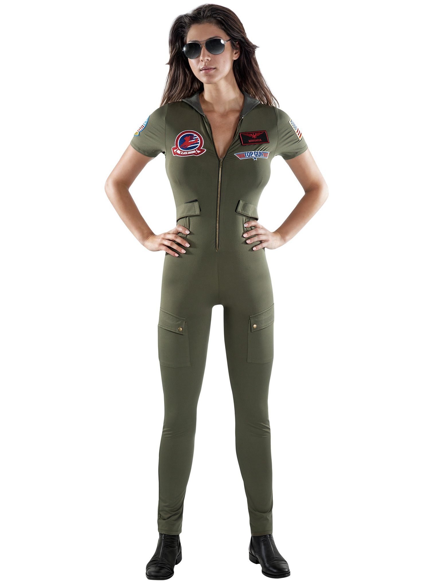 Kultig und verführerisch: Sexy Top Gun Catsuit Kostüm mit Reißverschluss, Taschen und Original-Aufnähern.