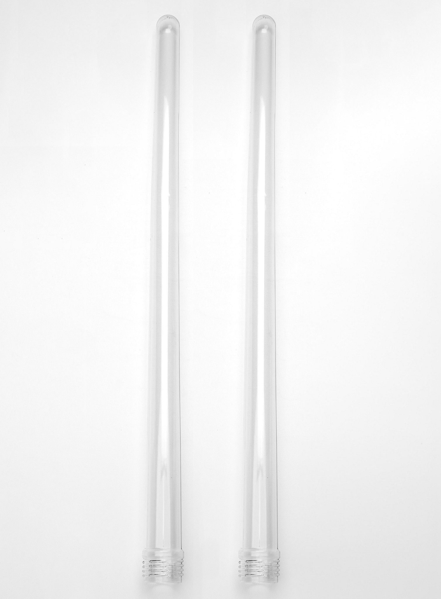 Die Klingen sind 46.5cm lang, haben am unteren Ende ein Gewinde mit einem Durchmesser von 26.5 mm (gemessen ohne Gewinde-Erhöhungen) und passen auf unser Doppellichtschwert (141078) - und mit ein bisschen Glück passen sie auch auf andere Spielzeug-Lichtschwerter.