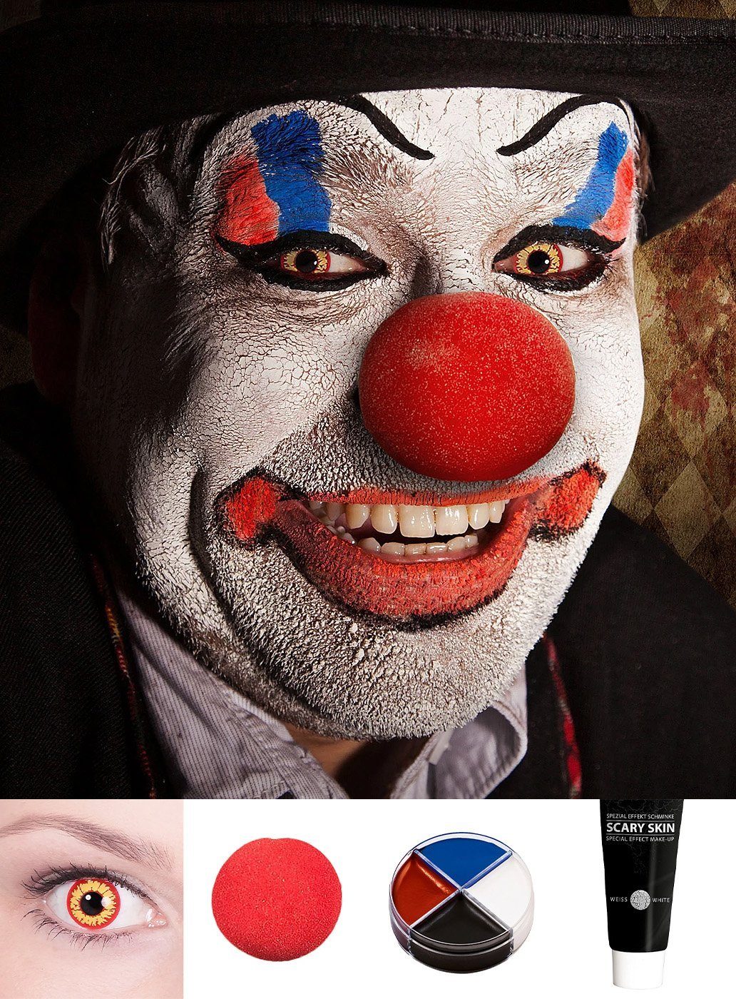 Lieferumfang | - Make-up Set Horror Clown fünfteilig- Creme Make-up- Rote Clownsnase- Scary weiß- ein Paar Kontaktlinsen- ausführliche Anleitung |