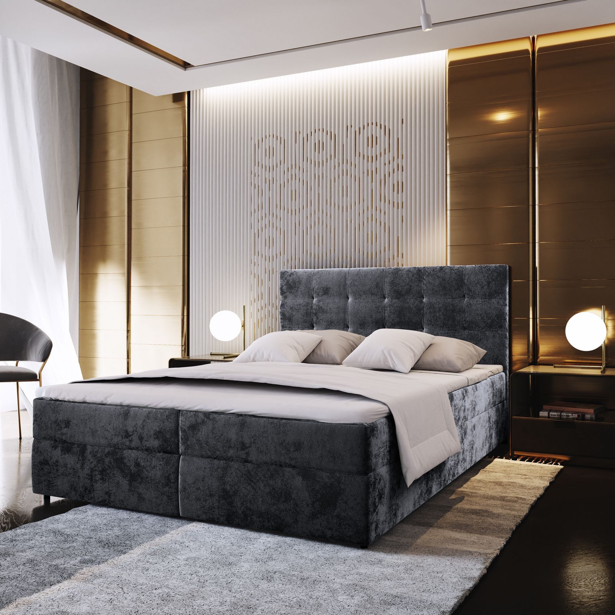 Das dekorative Kopfteil und der angenehm weiche Stoff COSMIC 100 verleihen dem Bett ein modernes und zeitloses Aussehen, das sich in jedes Schlafzimmer perfekt einfügt.