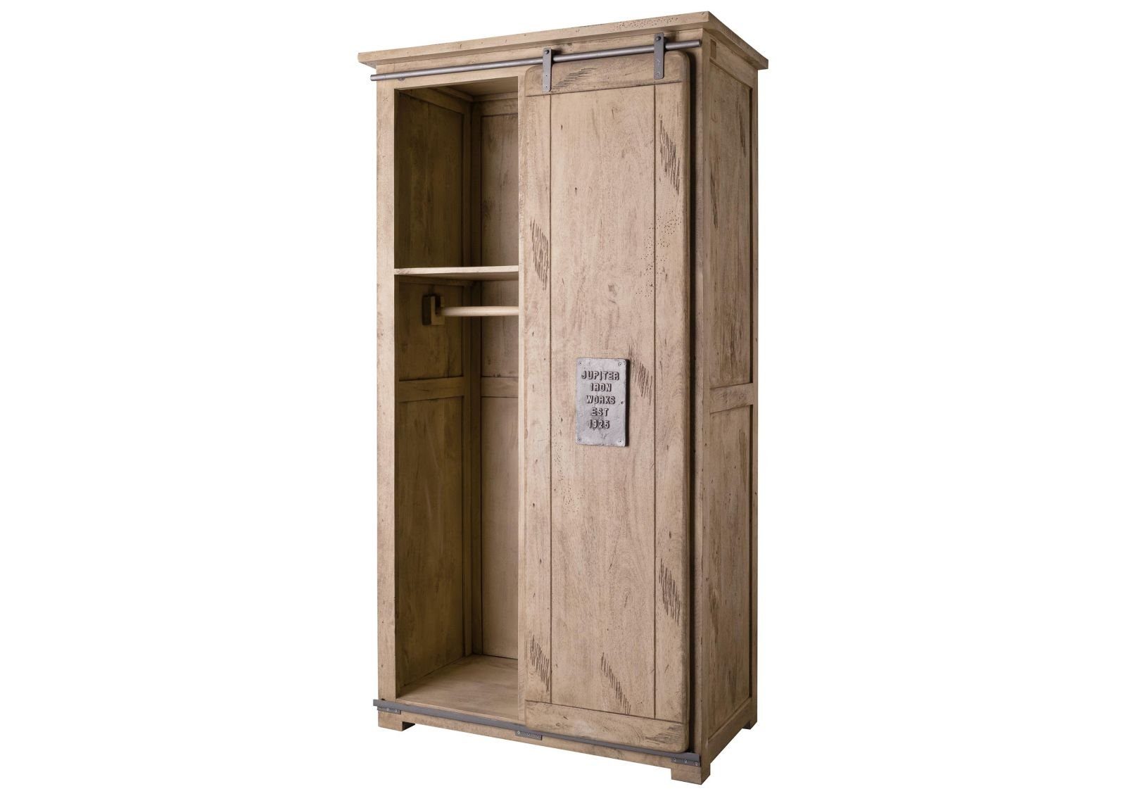 Stilecht mit Stauraum: Industrial-Schiebetürenschrank aus Mangoholz Schicke Kleidung schick verstaut: Das gelingt mit diesem Schrank der RAILWAY Serie, der aus massivem Mangoholz gefertigt wurde. Das massive Möbelstück präsentiert das ausdrucksstarke Holz von seiner besten Seite. Unter einer aschigen, grauen Lackierung zeigt sich deutlich der signifikante Hobelschlag im Holz. So erhält es eine einzigartige Struktur und zeigt das handwerkliche Können, das dahintersteckt. Die dunklen Eisenelemente an der Front der Schranktür bieten die perfekte Kombination. Sie geben dem Schrankmöbel einen industriellen Touch. Im Inneren des 100 cm breiten Schiebetürenschrankes finden sich außerdem vier großzügige Regalfächer und eine Kleiderstange.
