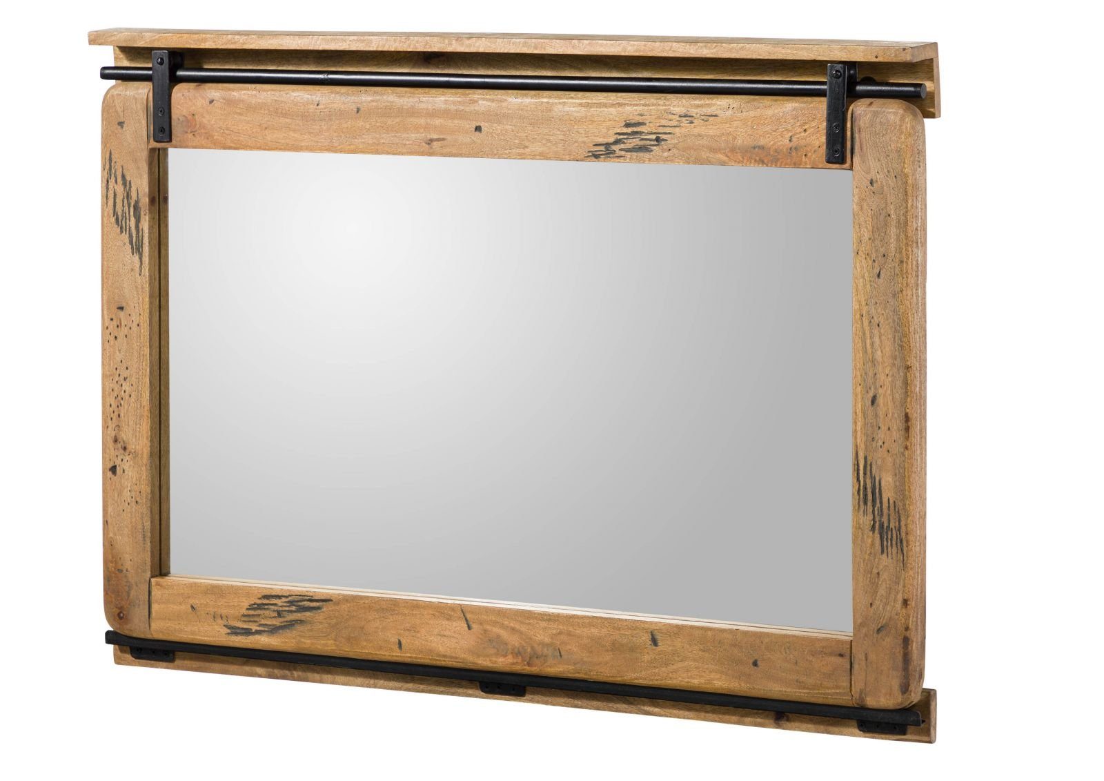 Markanter Holzspiegel: Rustikal mit Metall und massiver Mango Dieser Spiegel in der Размер 114x6x80 cm aus Mango-Massivholz zeigt, wie wenige Details den ganzen Look verwandeln können: Am oberen Rand des Holzrahmens befindet sich eine schwarze Stange aus Metall, die von zwei grob gearbeiteten Scharnieren dort befestigt ist – parallel zu drei weiteren Metallelementen am unteren Spiegelrand. Aus dem Wandspiegel wird so ein dekoratives Objekt in angesagter Industrial-Optik, das perfekt mit anderen Möbelstücken dieser Stilrichtung harmoniert.