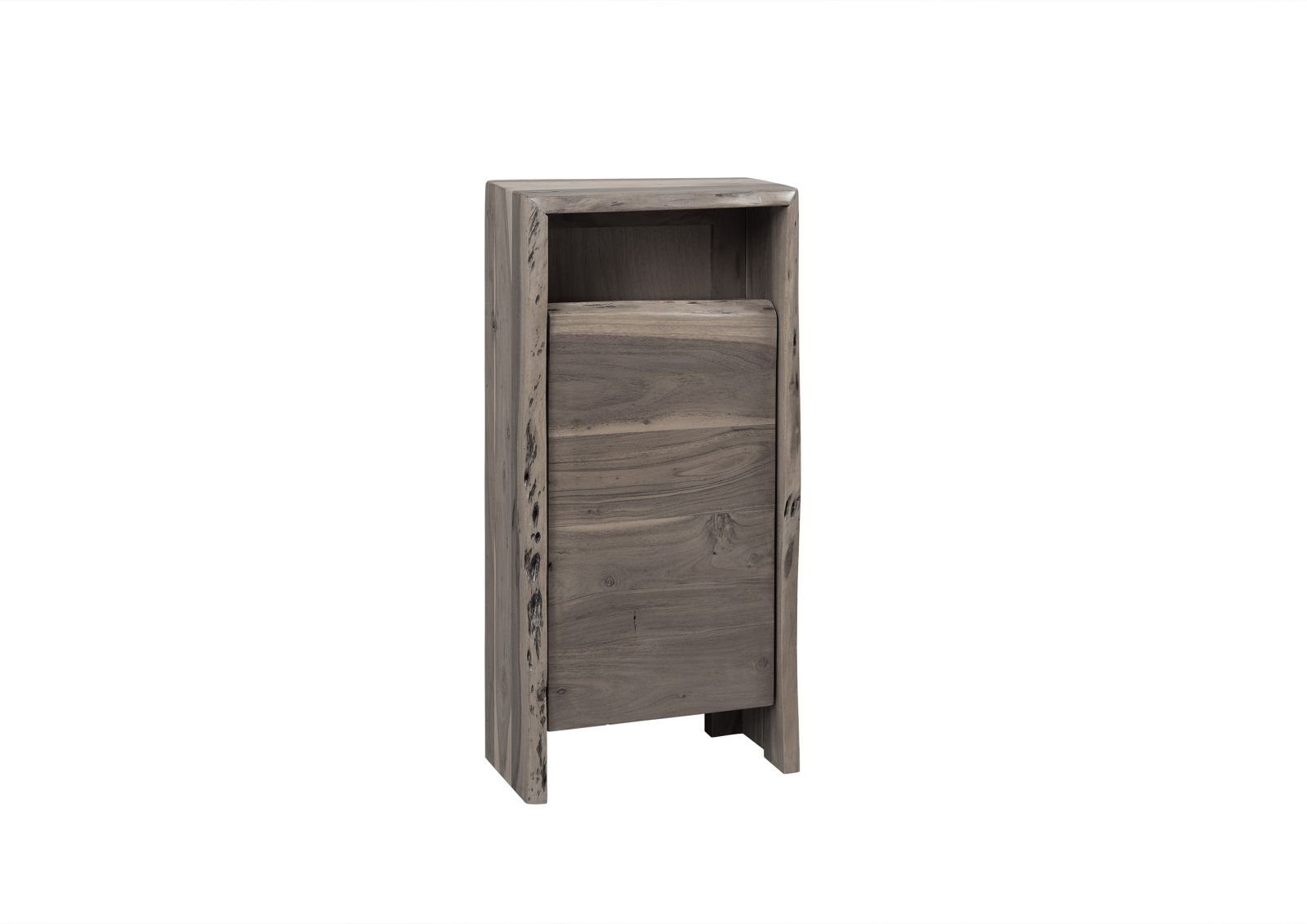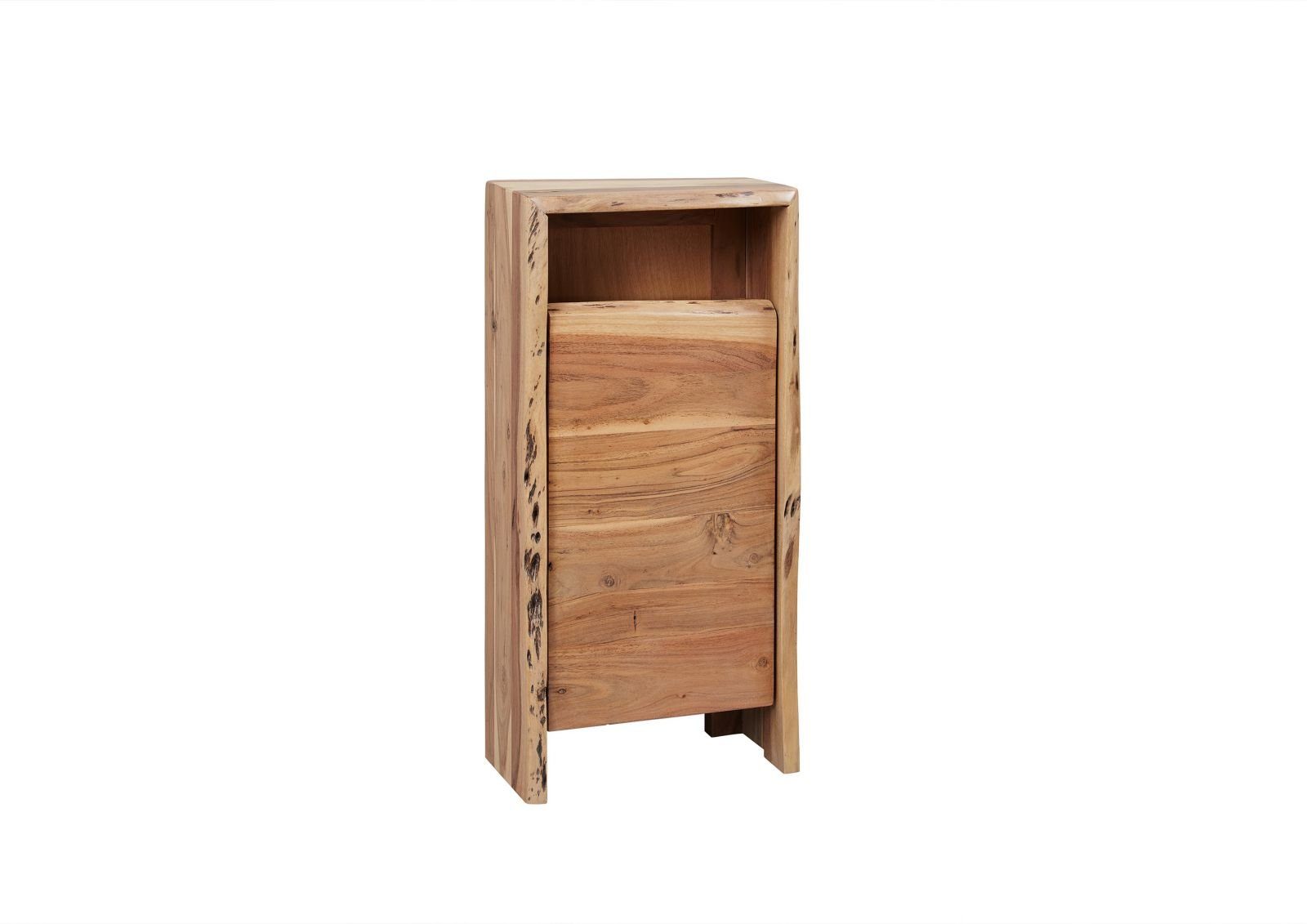 Zeigen Sie sich naturbetont mit diesem Unterschrank der Wohnserie PURE ACACIA. Das Einrichtungsstück besteht aus Akazienholz in vollmassiver Qualität. Die Hauptrolle im Design spielt die markante Maserung, die eindrucksvoll unter dem Finish hervorscheint. Auch die natürliche Form des Materials wurde in die Gestaltung integriert: Die leichten Unebenheiten des Baumwuchses bilden ein wichtiges Element des Designs. Im Inneren gibt es drei Ablageflächen, wobei das obere Fach offen ist. Durch die hier leicht überlappende Oberkante der Front entsteht ein Eingriff, der zugleich als Türgriff dient.
