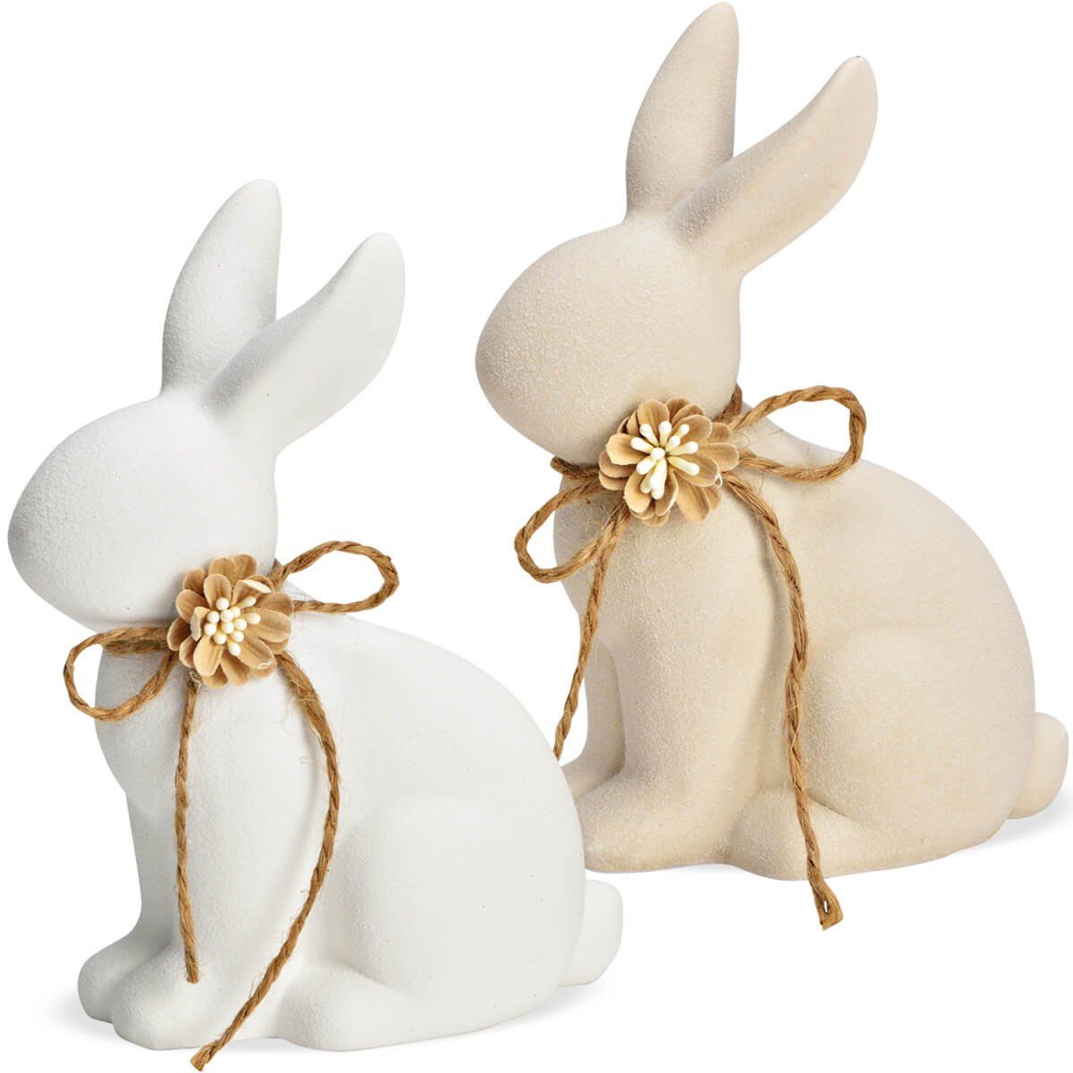 Moderne Osterhasen Dekofiguren aus Keramik im Set im Scandi Stil Landhausstil Osterdeko Hasen Schleife als Wohnzimmer, Schlafzimmer oder Flur Deko Figuren für Innen als Frühlingsdeko im Boho Style