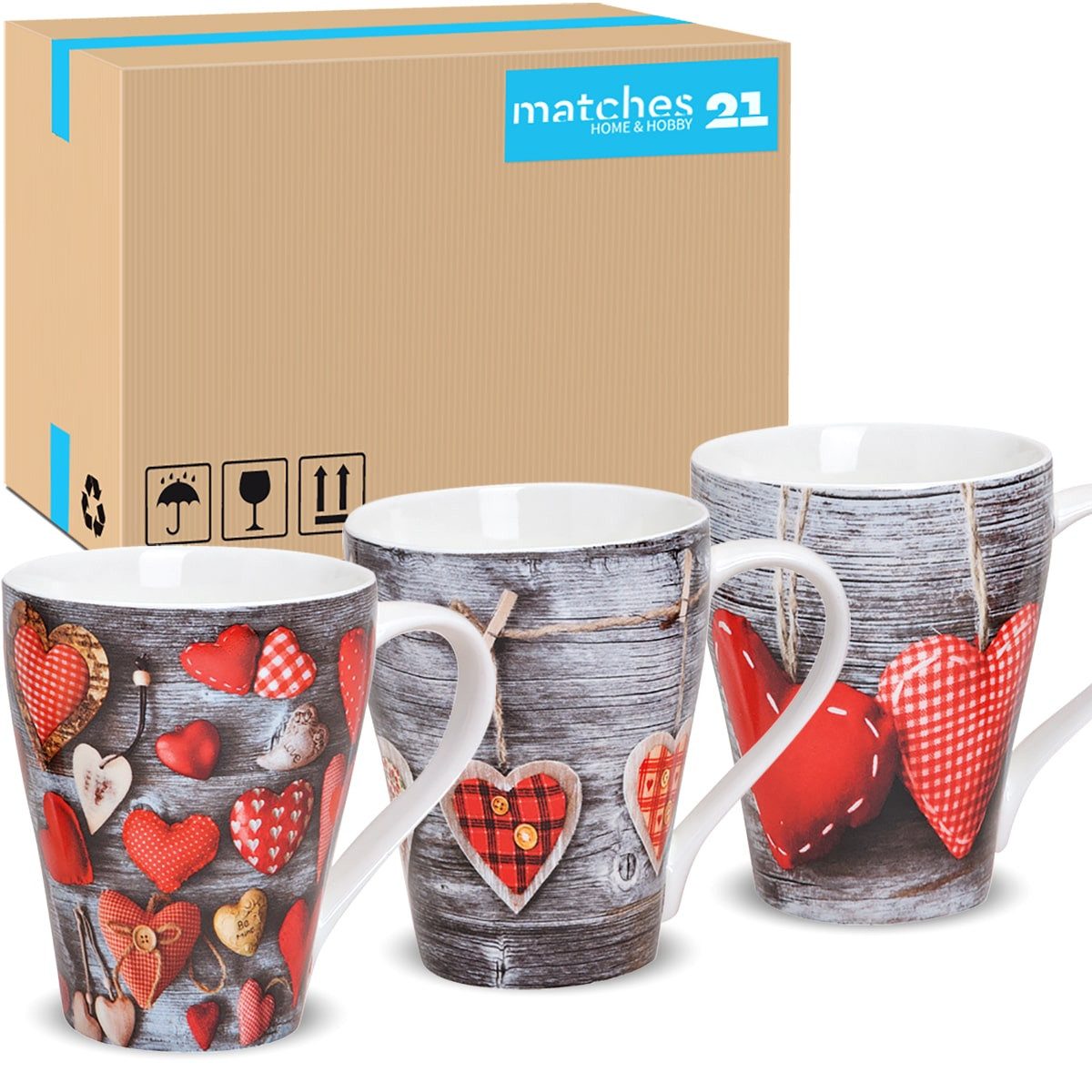 Schöne Tassen Becher Kaffeebecher Herzen & Holz rot grau 36 Stk. Karton aus Porzellan gefertigt, je 11 cm hoch / 300 ml