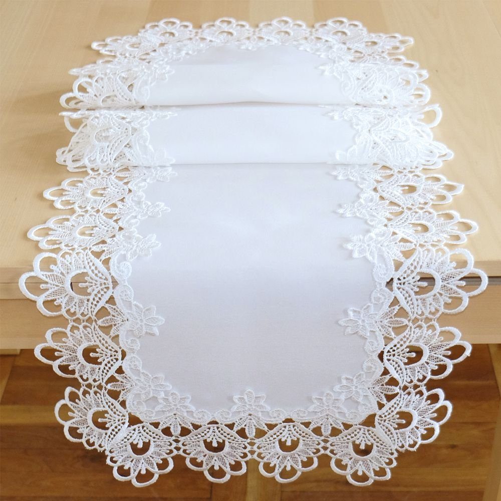 FESTLICHER MITTELPUNKT – Tischläufer INES 40 x 170 cm mit feiner Spitzenkante – perfekt für lange Tafeln & eindrucksvolle Tischdekorationen im Landhausstil.