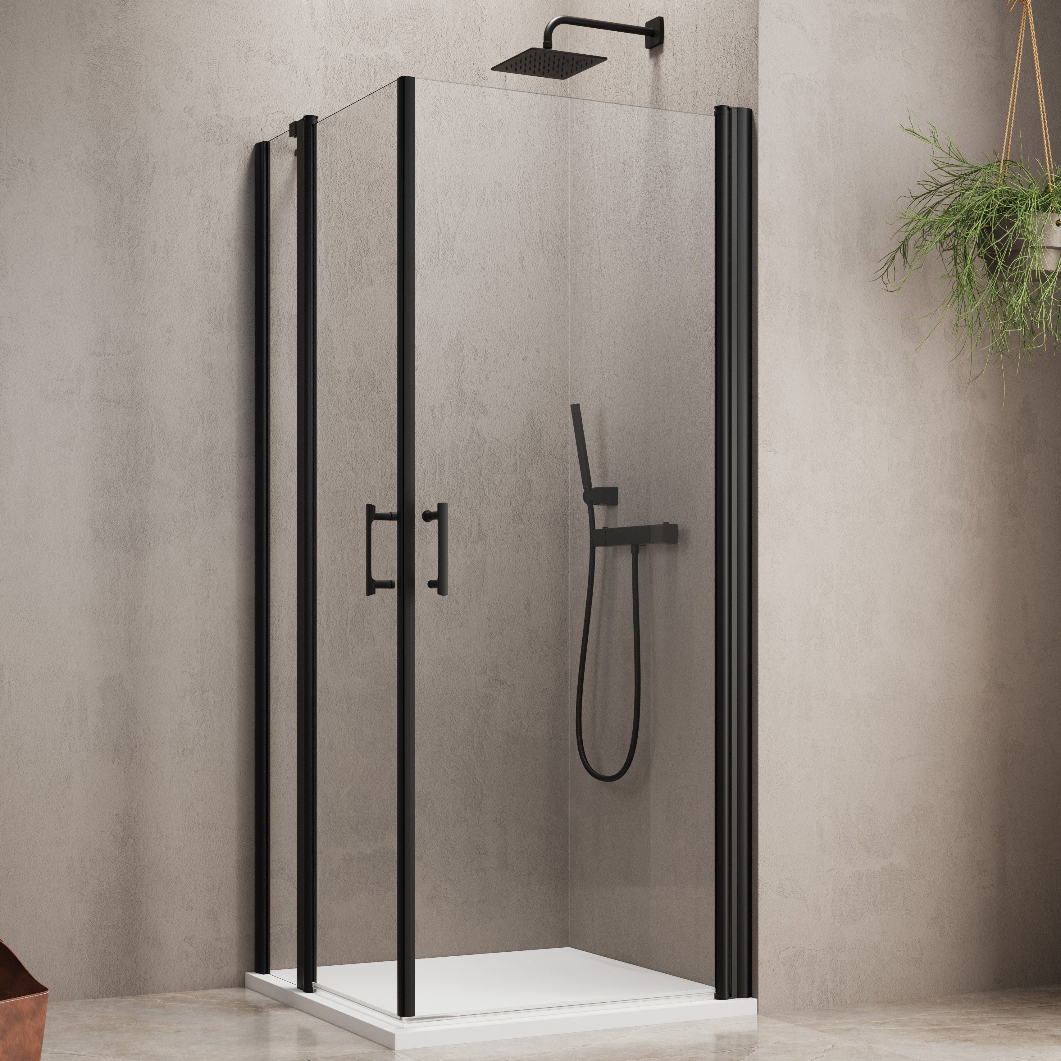 Duschkabine aus 6 mm Einscheibensicherheitsglas inklusive wasserabweiser Beschichtung. Drehsäulen/ Scharniere verfügen über einen integrierten Hebe-Senk-Mechanismus beim Öffnen und Спрятать. Beschläge und Profile sind in dieser Serie in modernem Mattschwarz oder Chromotik verfügbar. Dank großzügigem Verstellbereich des Wandanschlussprofils auch an nicht lotrechten Wänden montierbar