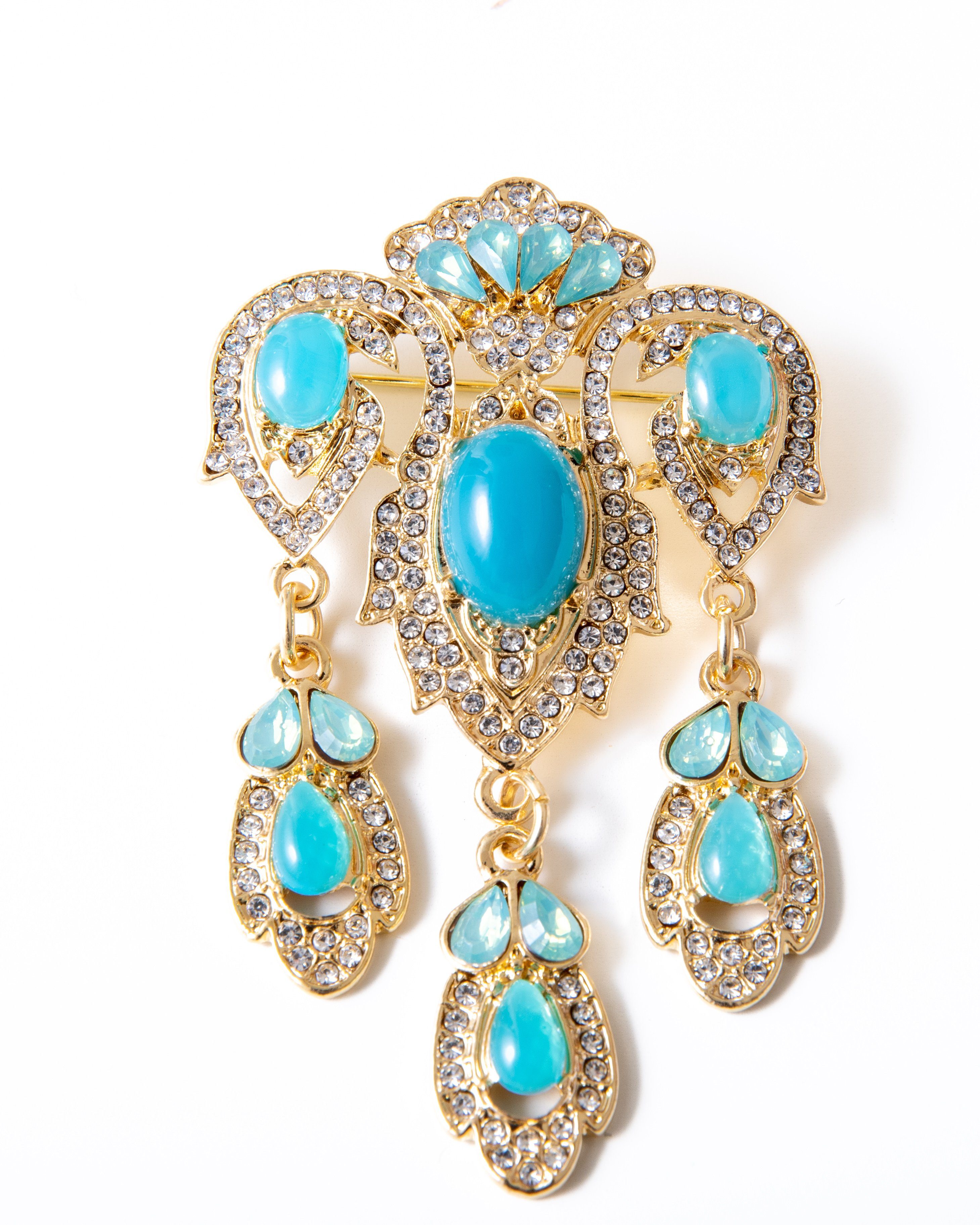 Besondere Merkmale | Metallbrosche mit Strass und türkis farbigen Glassteinen |