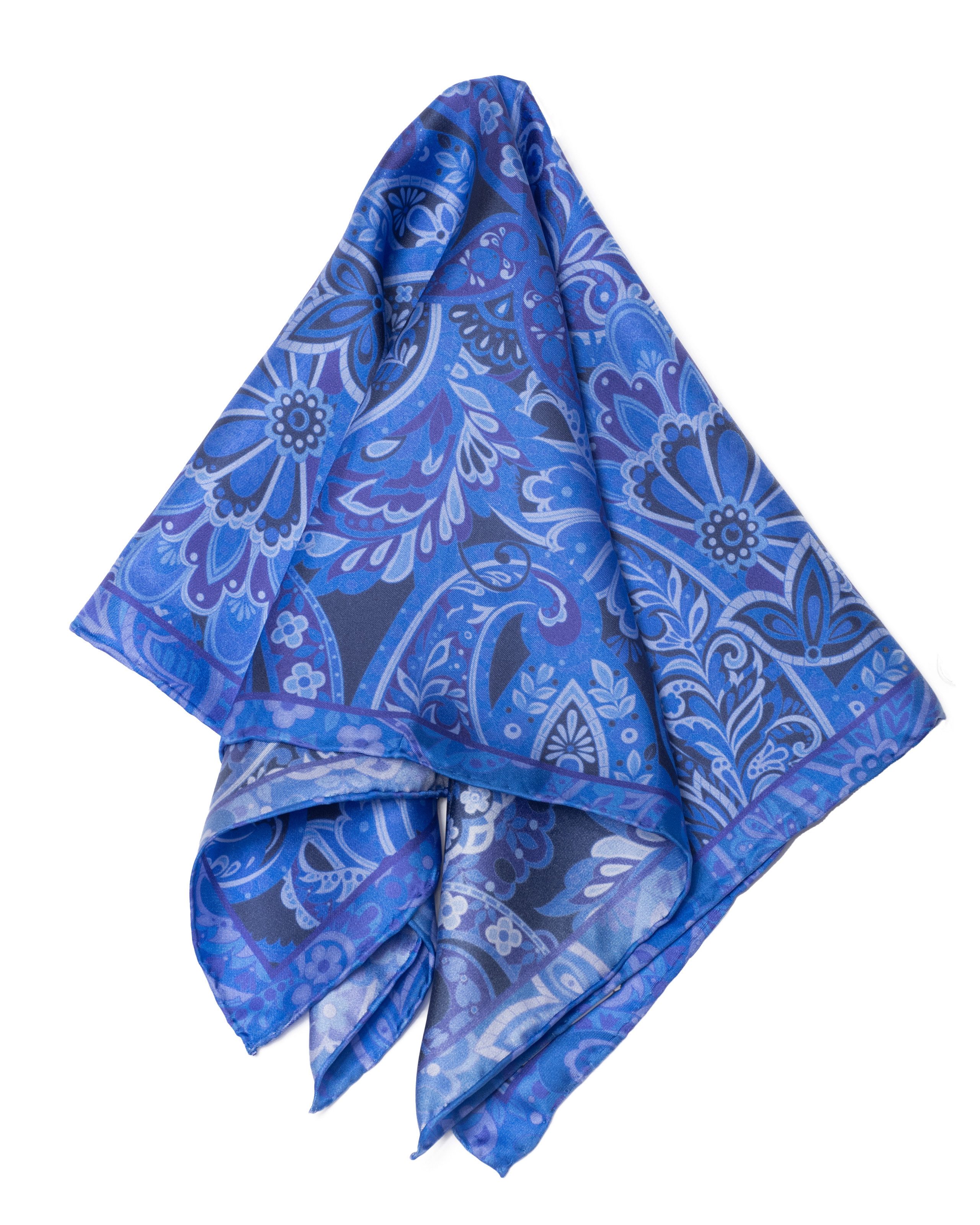 Ein Design – zwei starke Ausdrucksformen: dieses kunstvoll gestaltetes Seidentuch aus feinster Twillseide ist in zwei ausdrucksstarken Farbvarianten erhältlich– leuchtendes Königsblau und tiefes Purpur. Das detailreiche Muster vereint florale Ornamente und elegante Paisley-Elemente zu einem ausdrucksstarken Gesamtbild. Ob als Halstuch, Einstecktuch oder kreatives Styling-Element – „Extravaganza“ ist ein echtes Statement-Piece für Damen und Herren, die Farbe und Charakter lieben. Ein Hauch von Luxus für jeden Anlass.