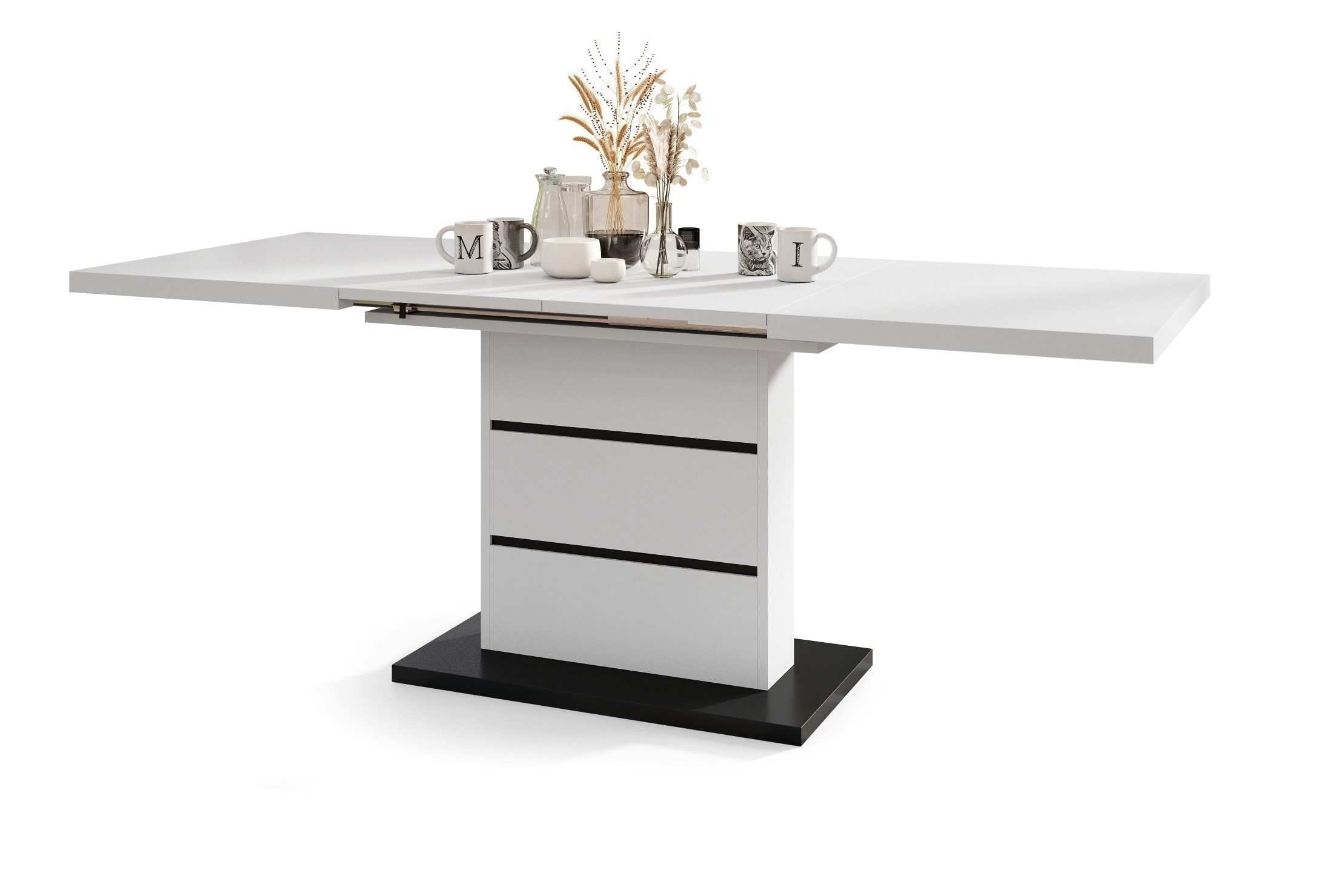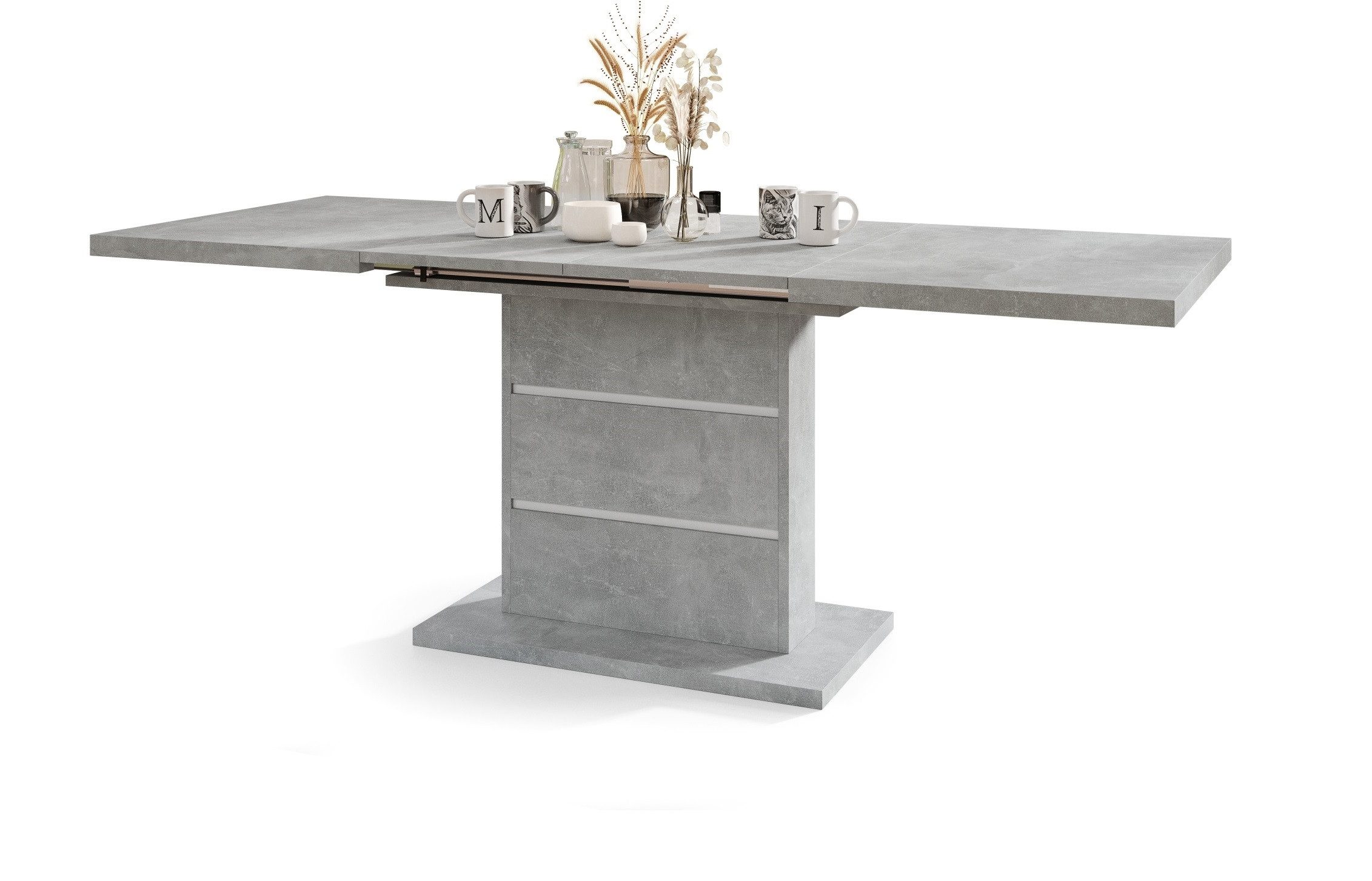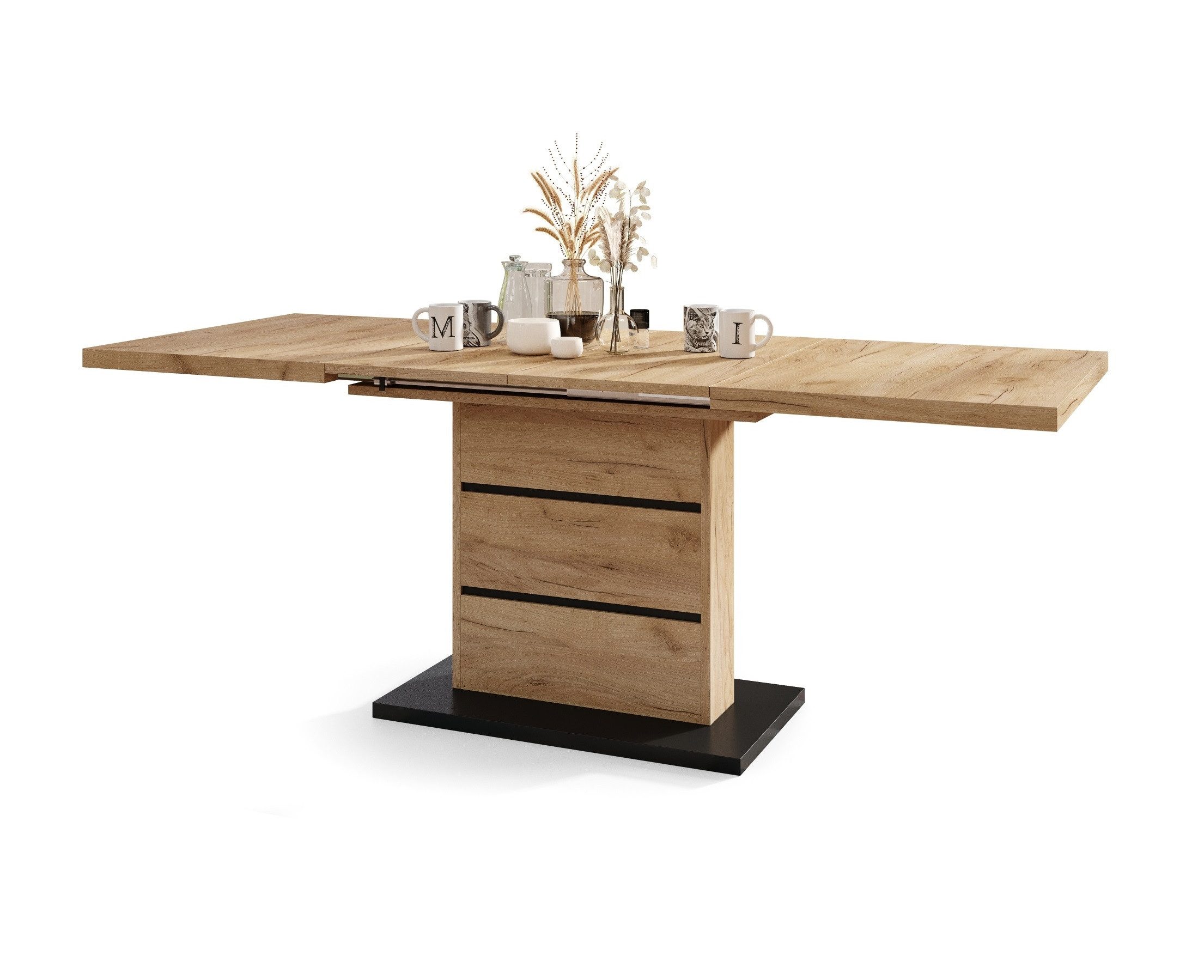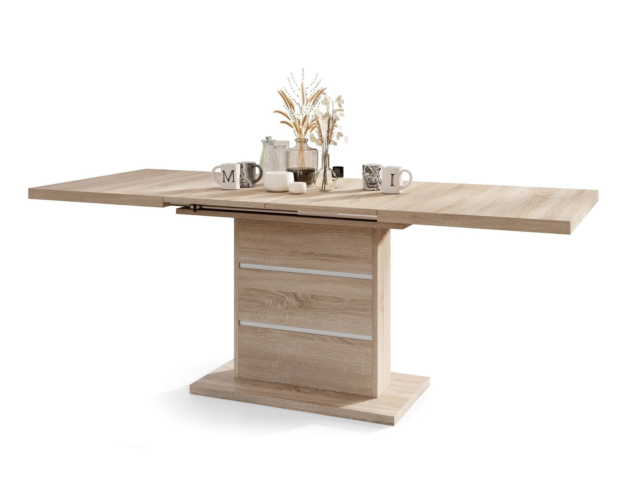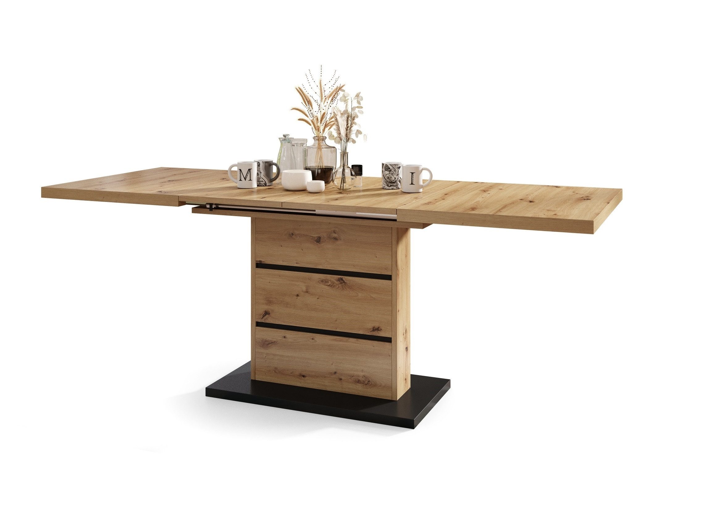 Ein schöner und sehr praktischer Esstisch, der sich in der Длина ausziehen lässt. Um die Длина des Tisches zu vergrößern, werden die beiden Oberplatten auseinandergezogen (durch das Ziehen nur einer Platte bewegt sich automatisch die andere - "Synchronauszug") und das Verlängerungselement aus dem Tisch genommen. Dieser Funktionstisch ist sowohl von seiner Erscheinung, als auch von seiner Funktionalität etwas besonderes. Durch seine Geradlinigkeit entsteht ein stilvolles und zeitloses Design, wodurch in Ihren Räumlichkeiten neue Akzente gesetzt werden.