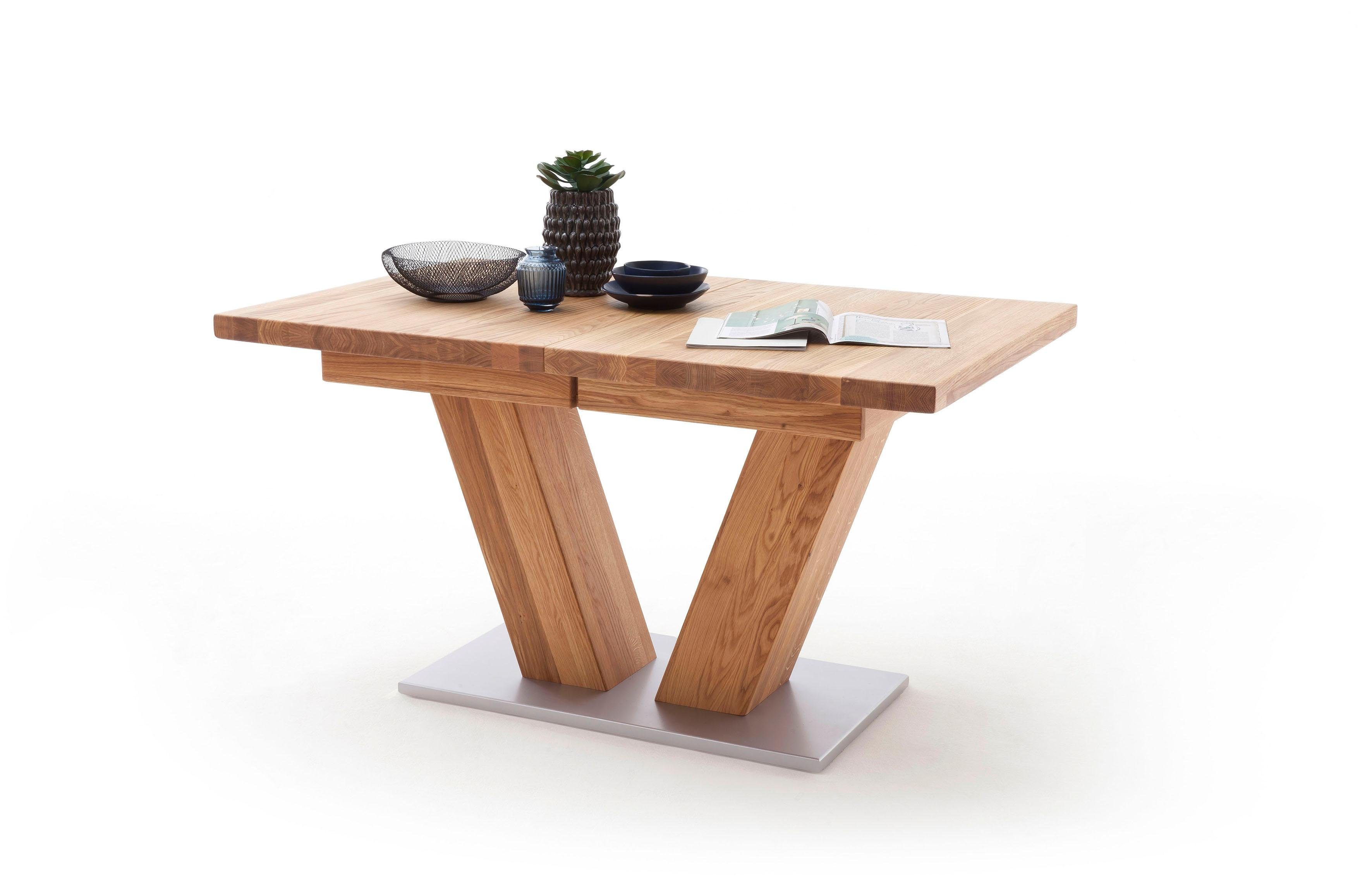 Wissenswertes | 2 Innenliegende Einlegeplatten Ausziehbarer Tisch mit Synchronauszug Massiv durchgehende Lamelle geölt, Bodenplatte in MDF silberfarbig lackiert Tisch belastbar bis 90 Kg Tischplatte aufgedoppelt 50 mm, Bodenplatte MDF silber lackiert |
