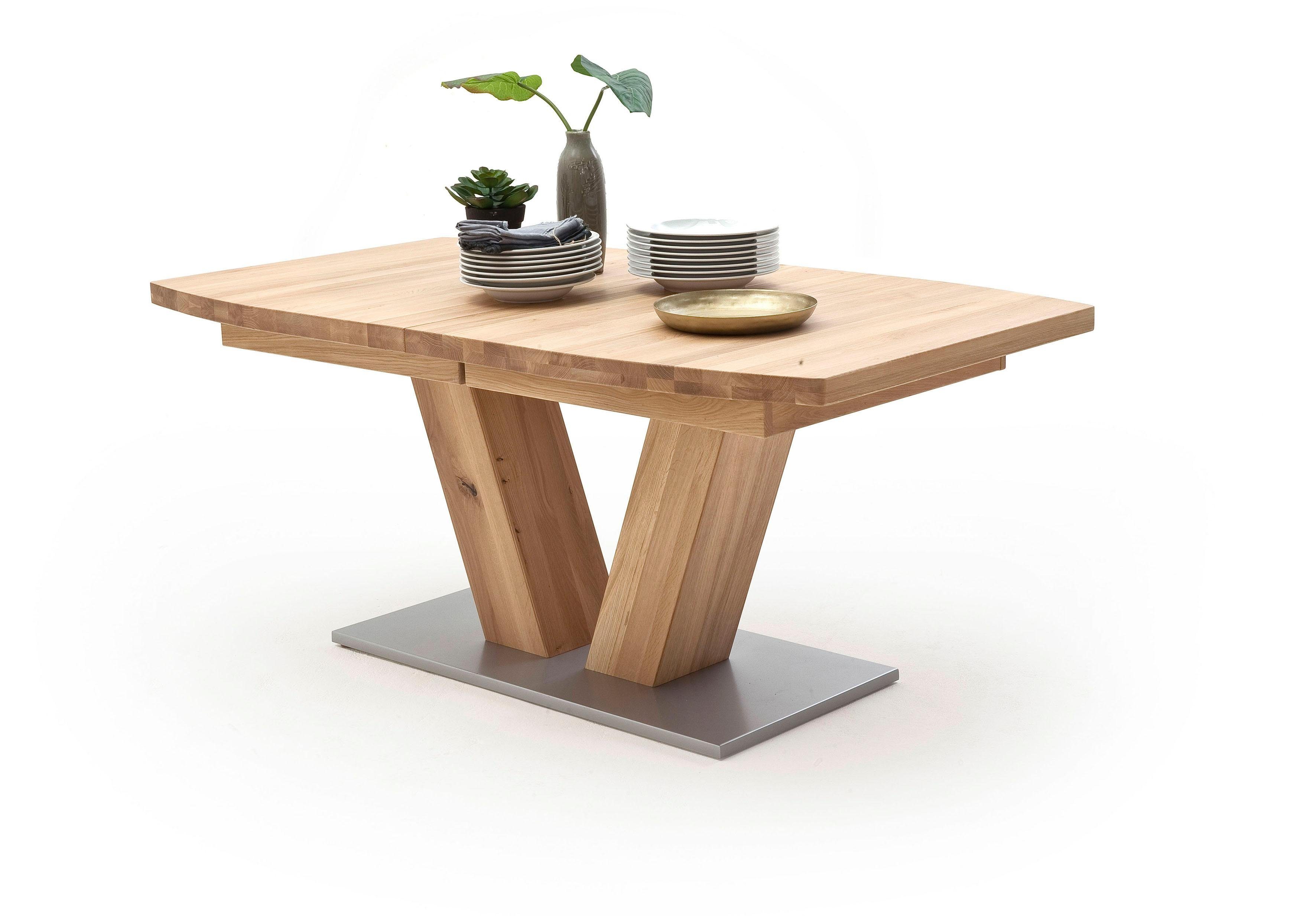 Wissenswertes | 2 Innenliegende Einlegeplatten Ausziehbarer Tisch mit Synchronauszug Massiv durchgehende Lamelle geölt, Bodenplatte in MDF silberfarbig lackiert Tisch belastbar bis 90 Kg Tischplatte aufgedoppelt 50 mm |