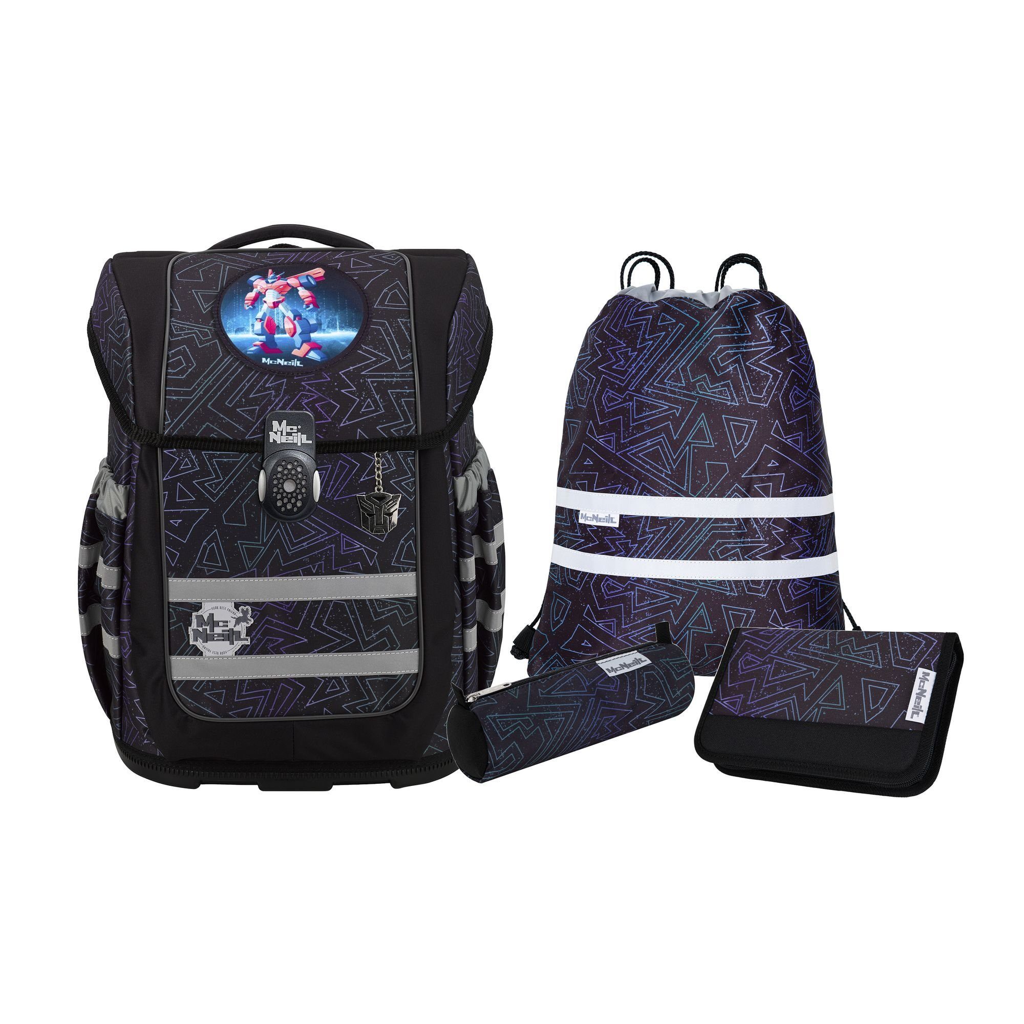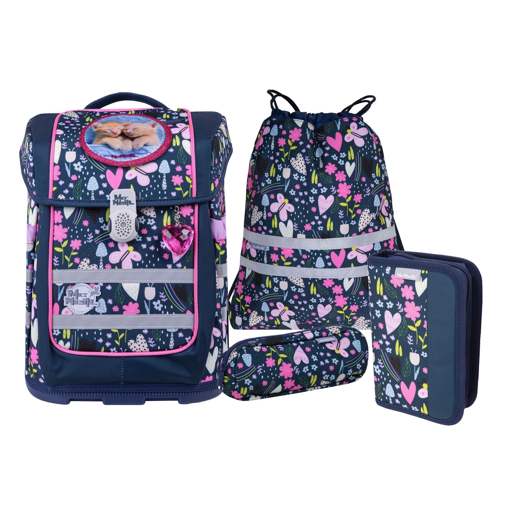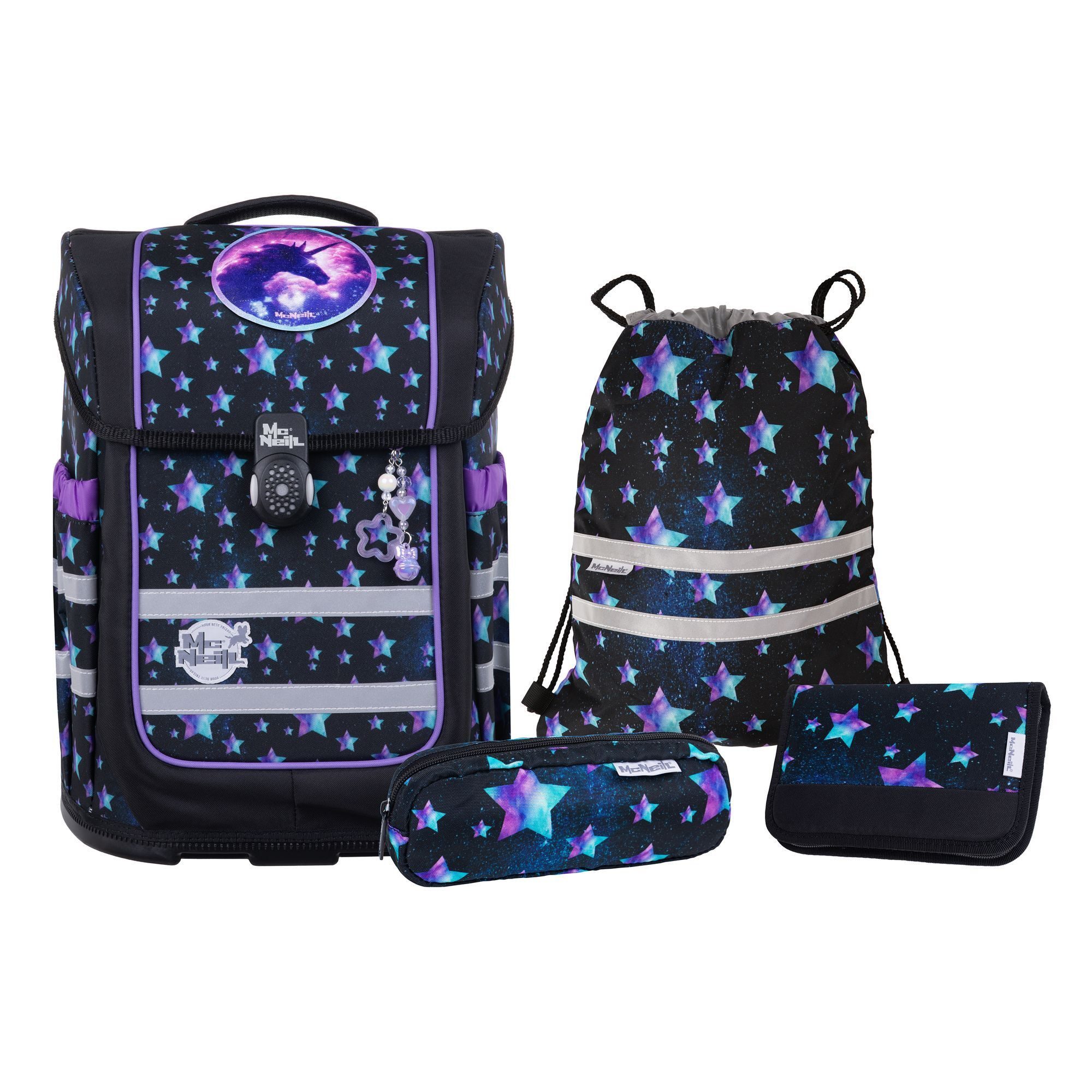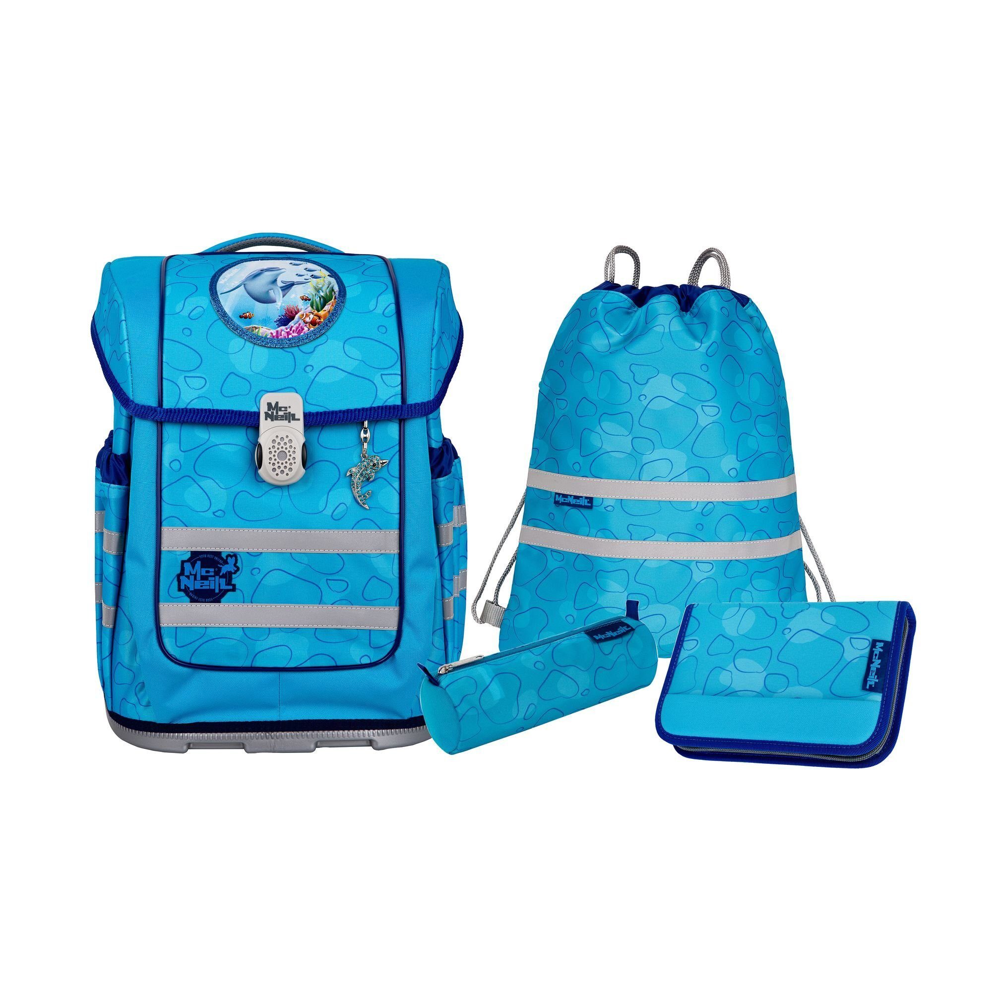 5-teiliges Schulranzen-Set von McNeill, bestehend aus Schulranzen, Sportschuhbeutel, Federmäppchen gefüllt, Schlampermäppchen sowie einem abnehmbaren/wechselbaren McAddy zum individualisieren Deines Schulranzens. Ein schöner Motiv-Anhänger ist inklusive. Top-Tragekomfort durch die atmungsaktive Rückenpolsterung, höhenverstellbare Gurte sowie Becken- und Brustgurt. Der Ranzen hat ein stylisches, reflektierendes Magnetschloss, welches leichtgängig wie von selbst schließt. Geräumige offene Seitentaschen können für die Trinkflasche oder sonstige Mitbringsel für die Schule verwendet werden. Schulranzen Außenmaß: 29 cm x 22 cm x 38,5 cm / Leergewicht: ca. 1.150 g / Volumen: ca. 20 l