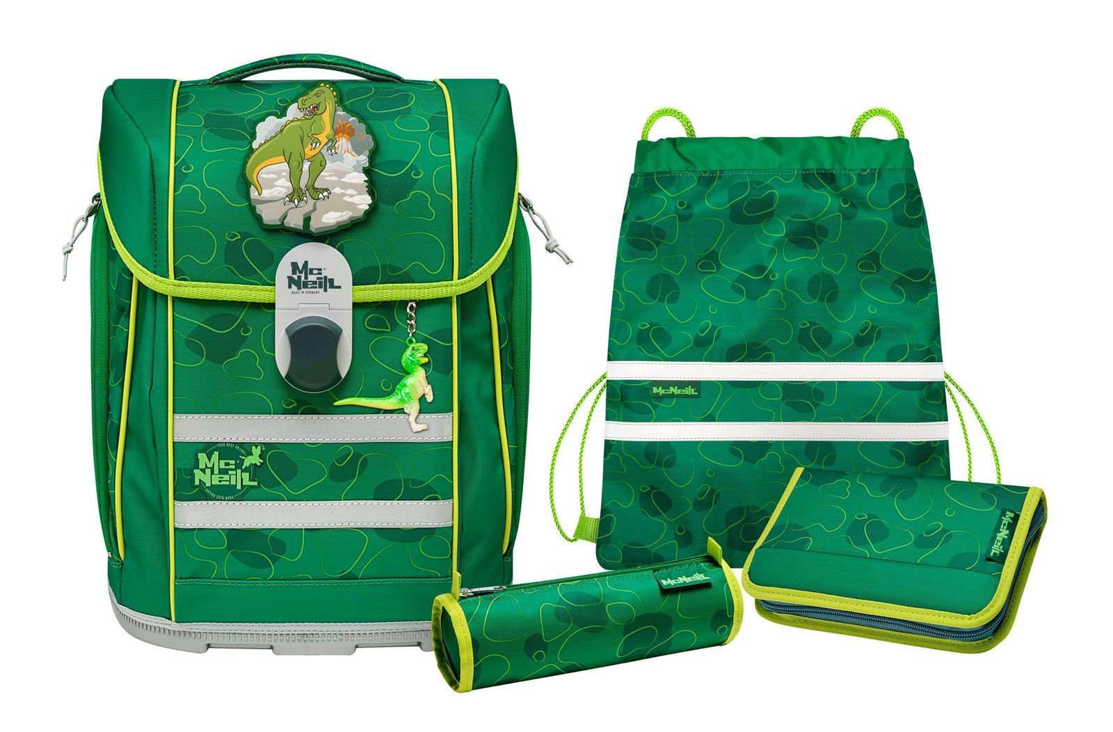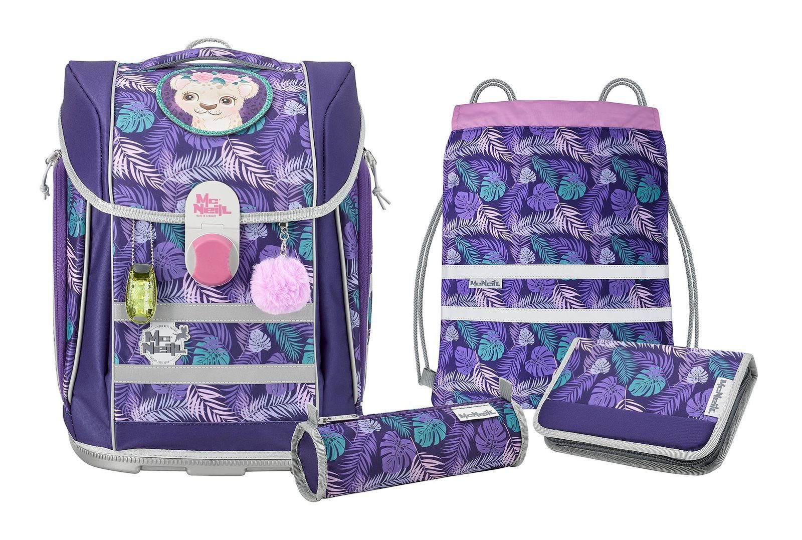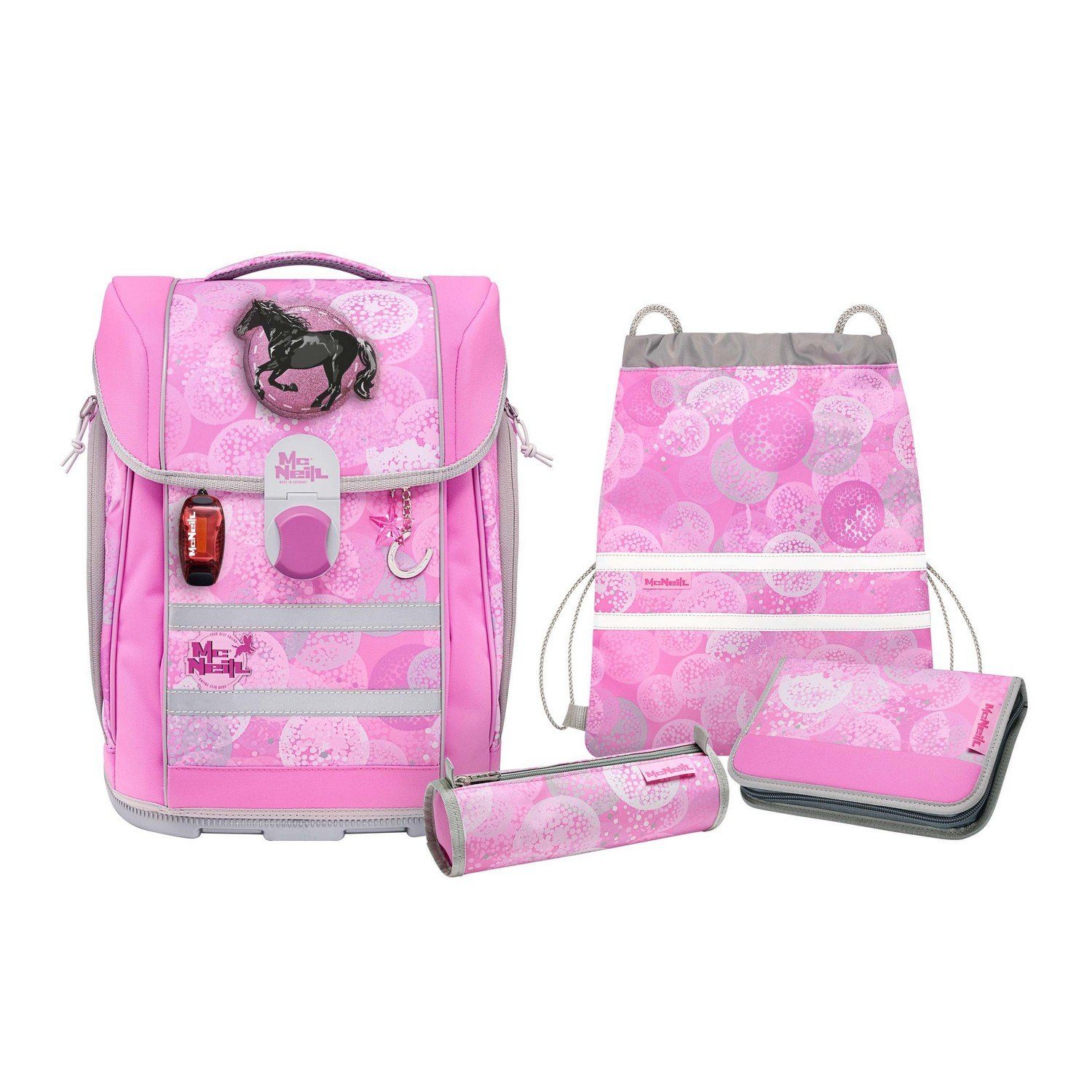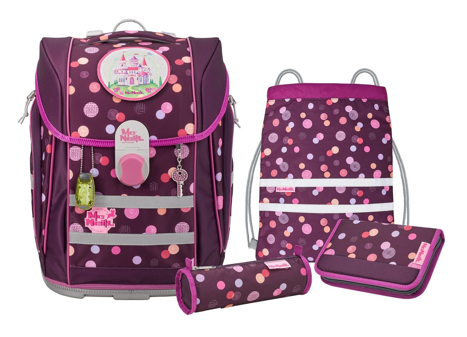 6-teiliges Schulranzen-Set von McNeill, bestehend aus Schulranzen, Sportschuhbeutel, Federmäppchen gefüllt, Schlamperrolle, Motivmagnet und an- und ausschaltbarem Leuchtanhänger. Top-Tragekomfort durch die atmungsaktive Rückenpolsterung, höhenverstellbare Gurte sowie Becken- und Brustgurt. Der Ranzen hat einen Schnappverschluss, der magnetisch angezogen wird und sehr leichtgängig wie von selbst schließt. Die Bodenplatte ist aus Plastik und bietet dadurch einen wasserfesten und sicheren Stand. Geräumige offene Seitentaschen können für die Trinkflasche oder sonstige Mitbringsel für die Schule verwendet werden. An- und ausschaltbarer Leuchtanhänger bietet eine sichere und optimale Lösung, wenn es um die Sichtbarkeit ihres Kindes geht. Schulranzen Außenmaß: 30 cm x 22 cm x 38 cm / Leergewicht: ca. 1.000 g / Volumen: ca. 20 l