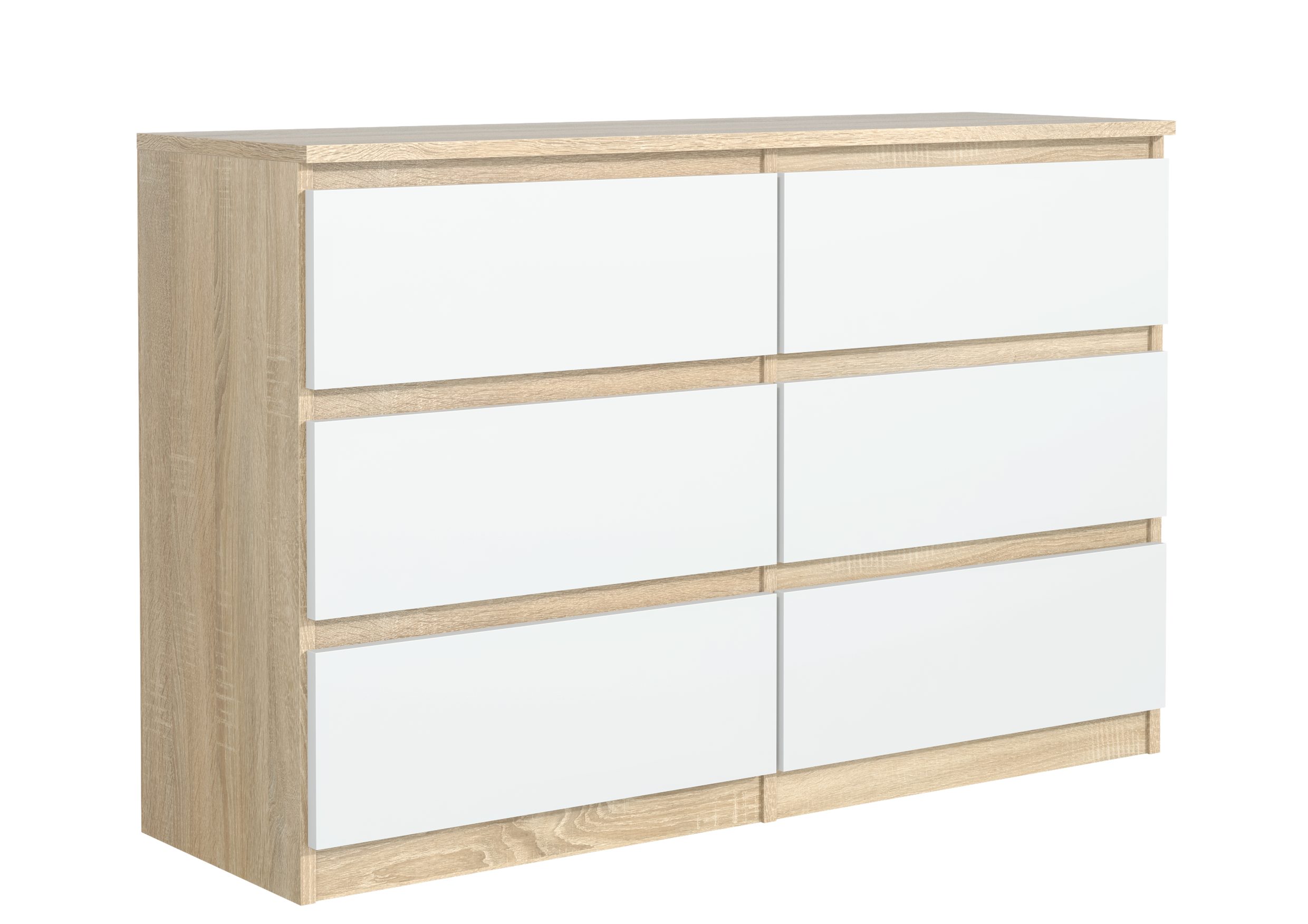 Die insgesamt sechs geräumigen Schubladen bieten ausreichend Platz zur geordneten Aufbewahrung von Kleidung, Wäsche, Accessoires oder Alltagsgegenständen. Die grifflose Front sorgt für ein minimalistisches Design, während die eingebauten Rollschienen ein leises und sanftes Öffnen der Schubladen ermöglichen.