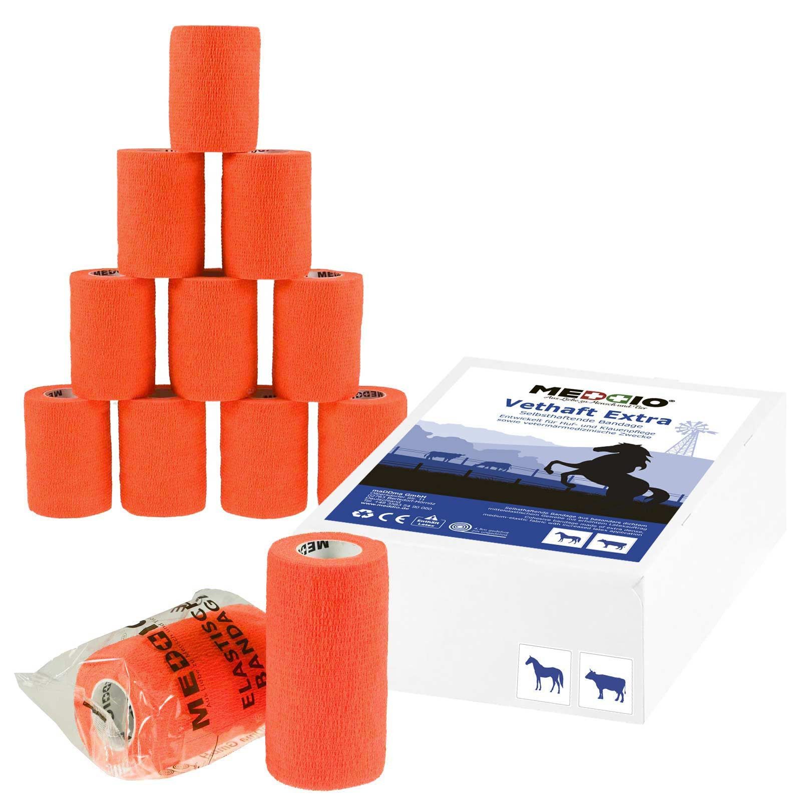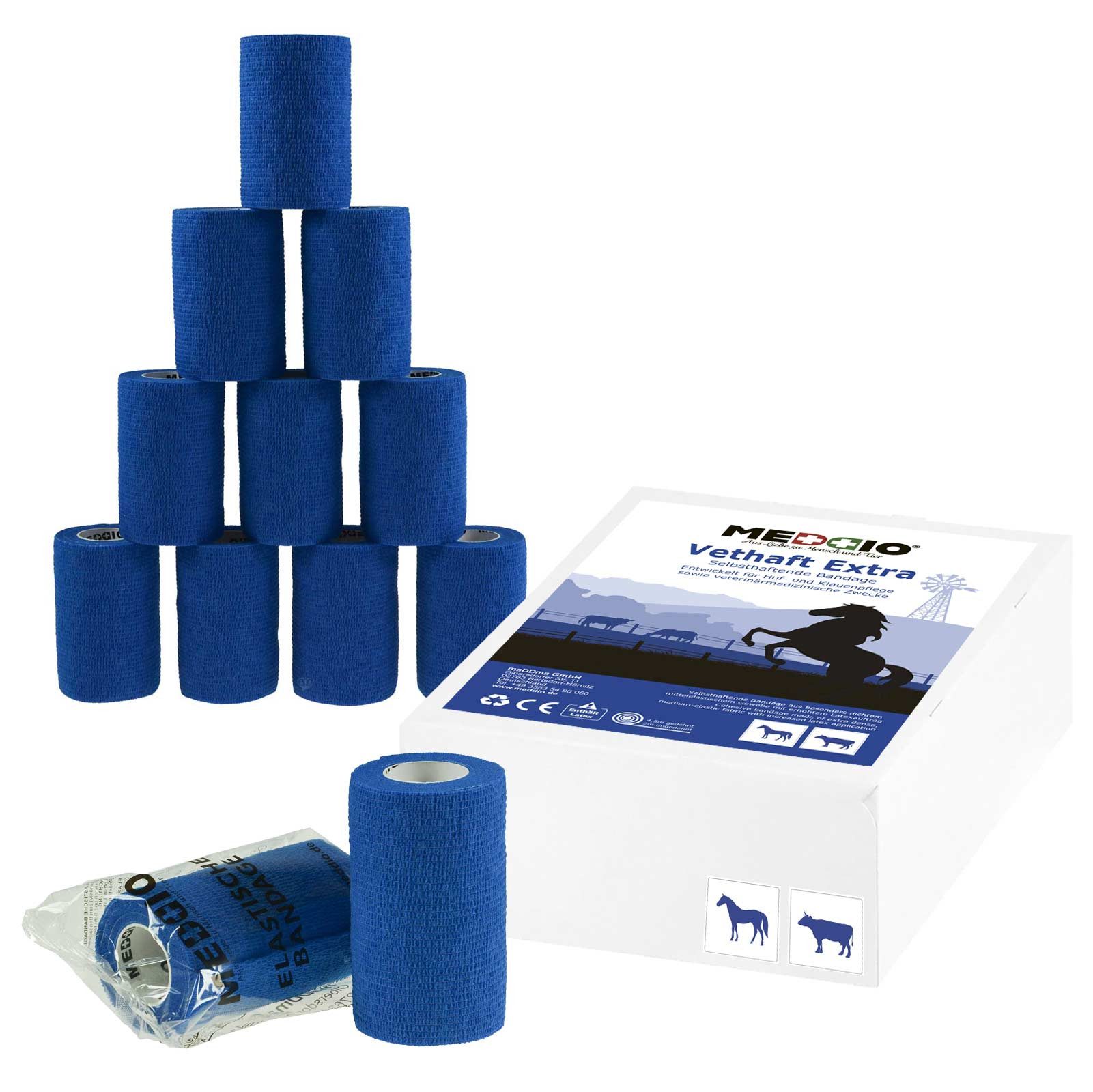 Die meDDio Vethaft Extra Haftbandagen eignen sich hervorragend als Stützbandage, zur Wundversorung und Prävention vor Verletzungen. Sie sorgen für eine Schonung und somit schnelle Regeneration bei Verletzungen an Sehnen und Bändern. Der innovative selbstklebende Fixierverband ist besonders stark strapazierbar. Die hochelastischen Bandagen sind selbsthaftend, verkleben aber nicht mit Haaren, Haut oder Wunden. Auch nach dem Anlegen lässt sich die Bandage wieder einfach lösen und der Verband korrigieren.