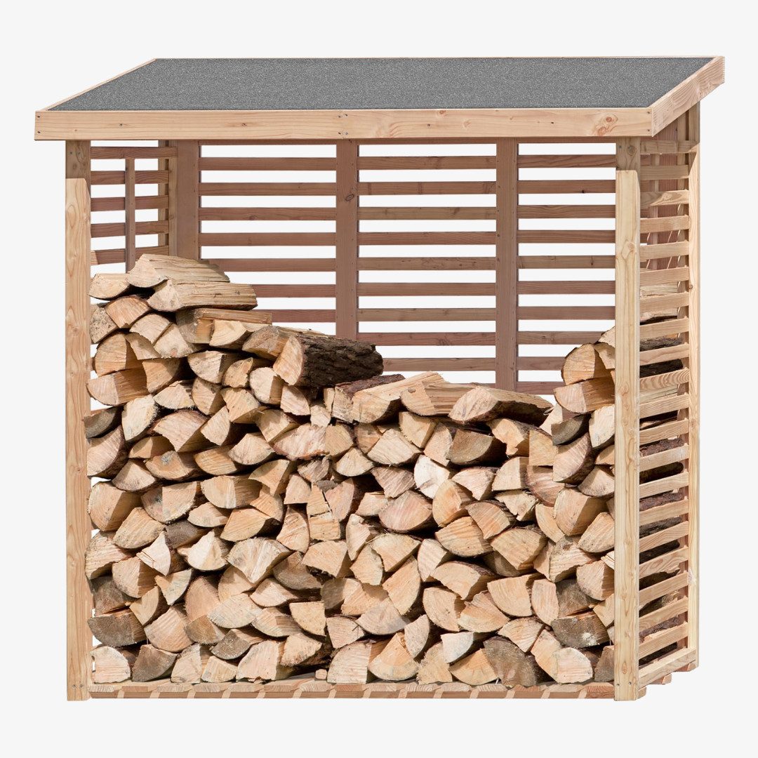 Die edle Oberfläche des Lärchenholzes, mit dem gelbrötlich bis bräunlichem Farbenspiel und einer ausgeprägten Maserung, bildet eine harmonische Verbindung mit dem rustikalen Look der Kaminhölzer. Praktisch für den schnel- len Zusammenbau sind die vorgefertigten Elemente wie Boden, Dach und Seitenteile. Das vorbereitete Dachele- ment wird mit Dachpappe belegt. Somit ist das Holz sicher vor Regen und Schnee geschützt. Die seitlichen Gitter sorgen für sicheren Halt und eine gute Durchlüftung der Hölzer. Durch das Bodenelement wird das Holz vor Feuch- tigkeit geschützt und von unten auch gut belüftet. So können Schimmel und Fäulnis vermieden werden.