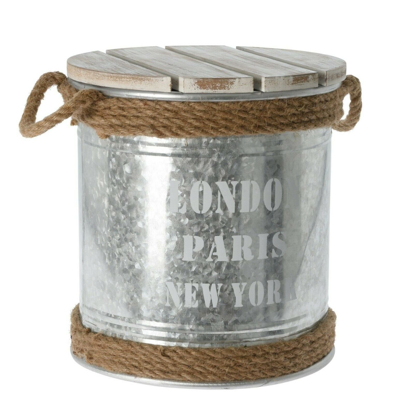 Beistelltisch industry Schöner Beistelltisch mit Stauraum im Industrie-Stil. Stabil und aus Metall gefertigt, mit dickem Holzdeckel und vorne mit großer Aufschrift "London, Paris, New York". Der Deckel ist abnehmbar und so kann die Tonne zusätzlich als Stauraum genutzt werden. Ob als kleiner Couchtisch oder z.B. als Nachttisch, Beistelltisch, Stauraummöglichkeit im Flur, als Ablage neben dem Sessel, usw. - der Tisch ist ein toller Hingucker. Die Ware wird fertig montiert geliefert. Auspacken, hinstellen und fertig. Gewicht, ca.: 2 kg Farbe: Tonne: silber, Zink Deckel & Schrift: weiß Tau: natur braun Material: stabiles Metall, dicker Holzdeckel & Tauseil-Griffe Maße, ca.: Durchmesser: 30 cm Höhe: 32 cm Tonne innen: Ø 28 x Höhe 30 cm