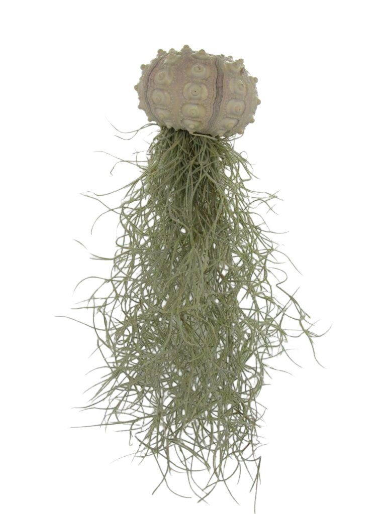 Bezaubernde Kombination aus Seeigelgehäuse und Tillandsia mit Aufhängung XXL Tillandsie / Luftpflanze 20-30cm ( Keine Kunstpflanze ) Der absolute Hingucker in deinem Zuhause und super pflegeleicht! Eine wunderschöne Deko und exotisch zugleich. Egal wo Du diese tolle Deko auch platzierst, diese Kombination wird in jedem Fall zum Eyecatcher. Auch bestens als Geschenk geeignet ! Jede Luftpflanze ist ein kleines Wunder der Natur. Diese Pflanze lebt von Licht, Luft, einwenig Wasser und benötigt keine Erde. Die Tillandsia ist ursprünglich in Südamerika beheimatet. Dort wächst sie in tropischen und subtropischen Gegenden. Diese wunderbaren Pflanzen freuen sich über einen hellen Standort ohne direkte Sonneneinstrahlung. In Räumen mit hoher Luftfeuchtigkeit fühlen sie sich besonders wohl. Zwei- bis dreimal pro Woche mit kalkarmem Wasser ( gerne auch Regenwasser ) besprüht reicht als Pflege absolut aus. Lieferumfang: Seeigelgehäuse ca. 6cm Ø & eine echte lebende Tillandsia im XXL Format ca. 20-30 cm lang ( keine Kunstpflanze ) Jede Deko Kombination ist ein Unikat. Nachdem es sich um lebende Pflanzen handelt können diese natürlich einwenig von den Bildern abweichen.