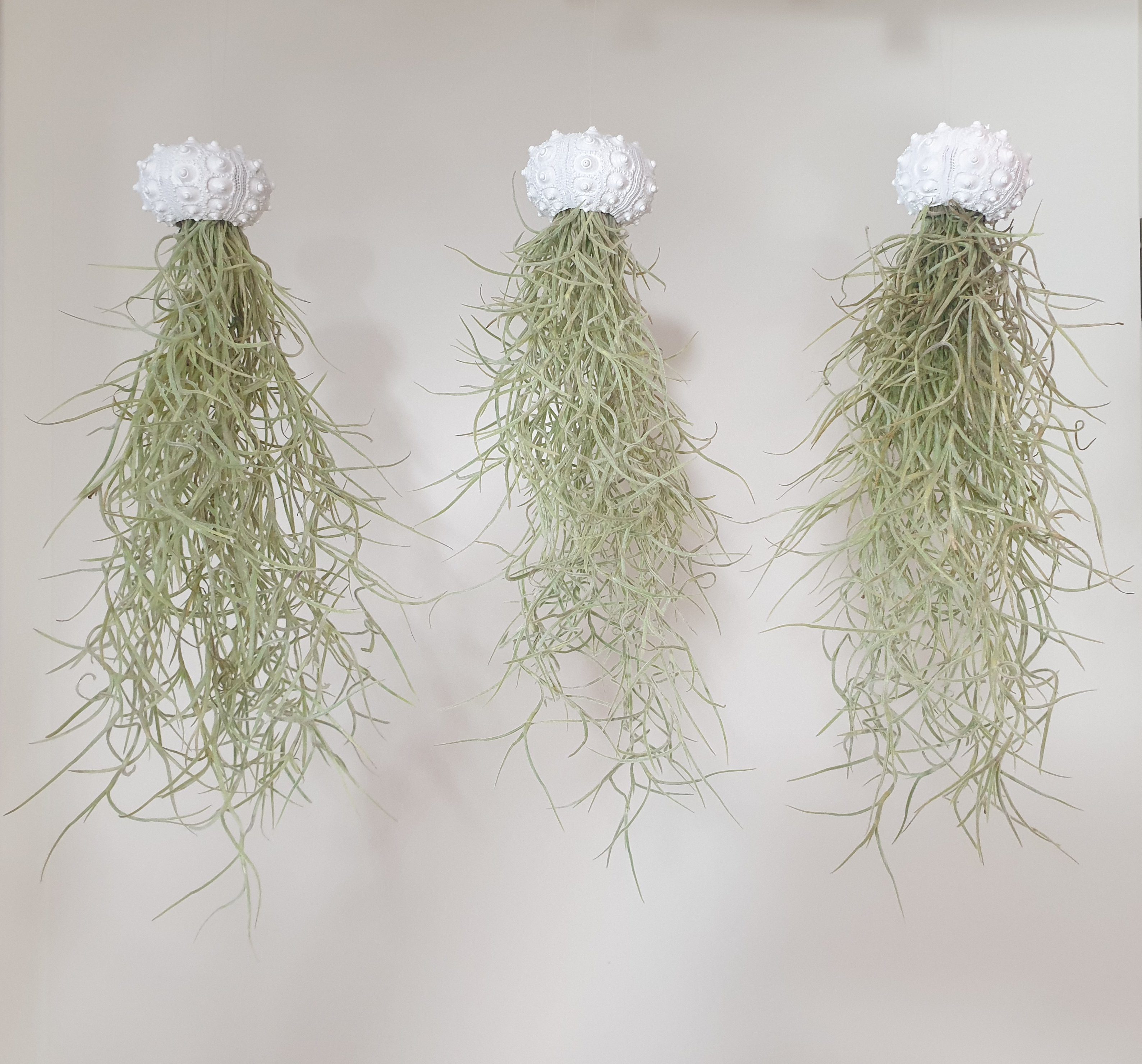 3er Set Seeigel mit Tillandsie XXL 30cm Luftpflanze Exotisches Flair für dein Zuhause 3er Set bezaubernde Kombination aus Seeigelgehäuse und Tillandsia mit Aufhängung XXL Tillandsie 30cm ( keine Kunstpflanze ) Der absolute Hingucker in deinem Zuhause und super pflegeleicht! Eine wunderschöne Deko und exotisch zugleich. Egal wo Du diese tolle Deko auch platzierst, diese Kombination wird in jedem Fall zum Eyecatcher. Auch bestens als Geschenk geeignet ! Jede Luftpflanze ist ein kleines Wunder der Natur. Diese Pflanze lebt von Licht, Luft, einwenig Wasser und benötigt keine Erde. Die Tillandsia ist ursprünglich in Südamerika beheimatet. Dort wächst sie in tropischen und subtropischen Gegenden. Diese wunderbaren Pflanzen freuen sich über einen hellen Standort ohne direkte Sonneneinstrahlung. In Räumen mit hoher Luftfeuchtigkeit fühlen sie sich besonders wohl. Zwei- bis dreimal pro Woche mit kalkarmem Wasser ( gerne auch Regenwasser ) besprüht reicht als Pflege absolut aus. Lieferumfang: 3x Seeigelgehäuse ca. 5cm Ø & jeweils eine echte lebende Tillandsia im XXL Format ca. 30 cm lang ( keine Kunstpflanze ) Jede Deko Kombination ist ein Unikat. Nachdem es sich um lebende Pflanzen handelt können diese natürlich einwenig von den Bildern abweichen.