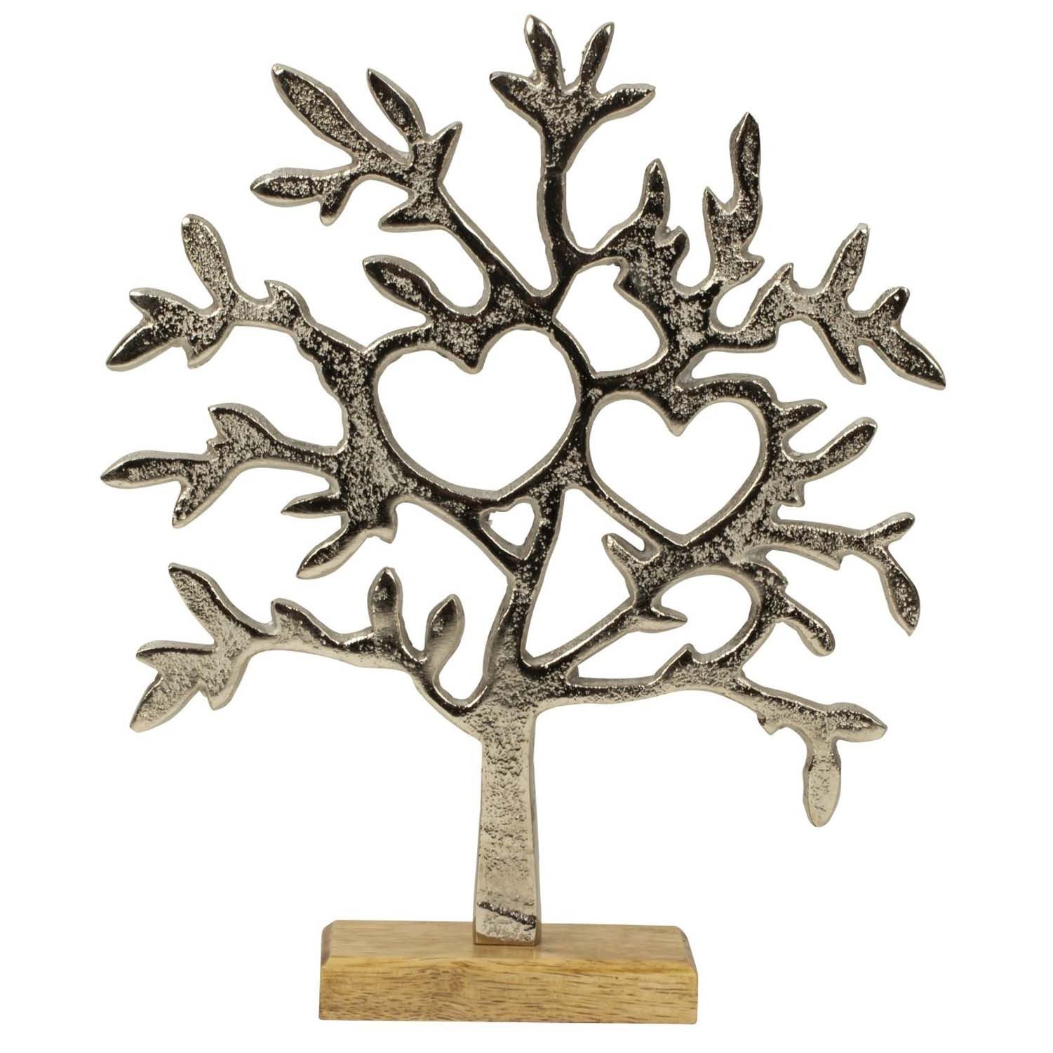Dekoaufsteller „Lebensbaum“ aus Aluminium mit zwei Herzen auf Holzsockel