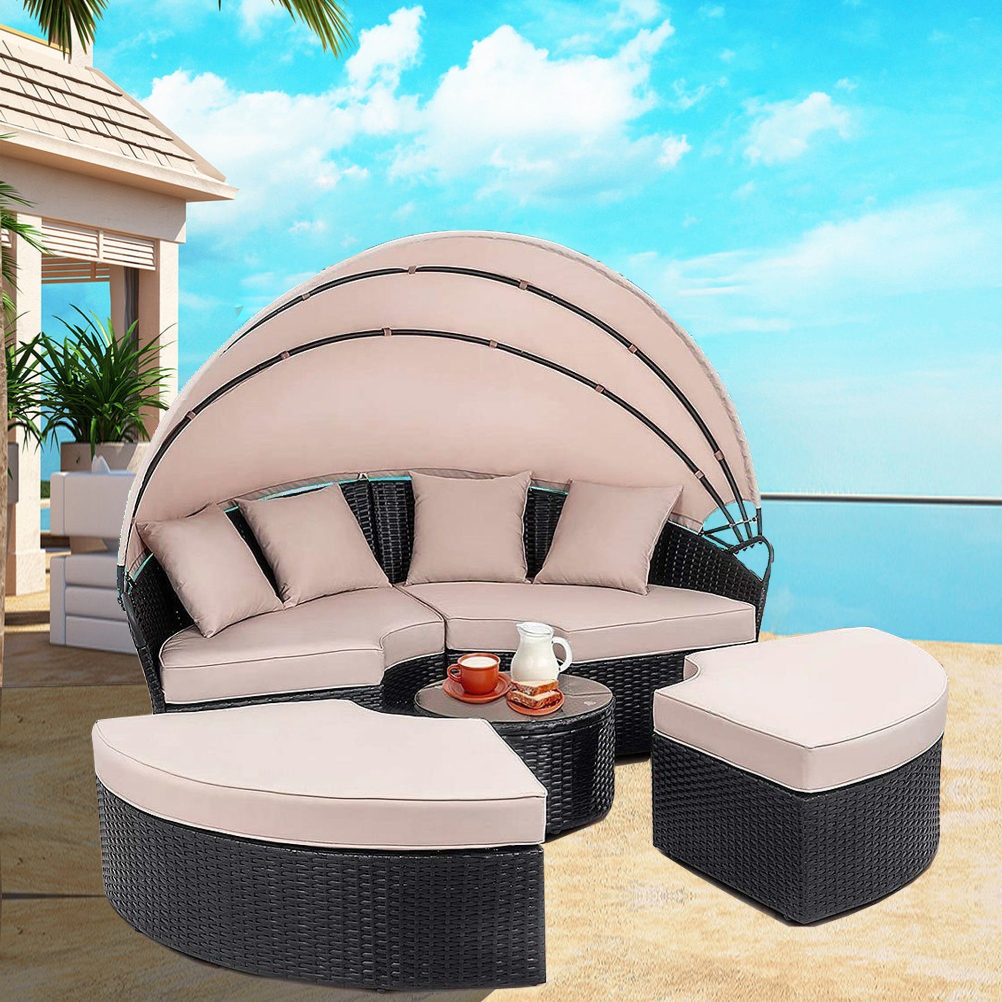 Die Sonneninsel wurde aus wetterfestem Polyrattan gefertigt und zeichnet sich so durch ein geringes Eigengewicht aus. Ein Metallgestell sorgt für Stabilität.