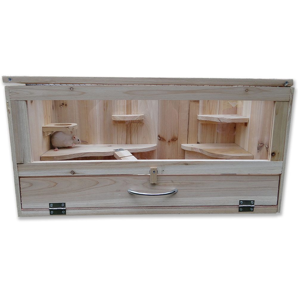 Dieser Käfig ist vor allem für kleine Nagetiere geeignet. Auf gleich mehreren Etagen bietet er den Tieren Platz zum Spielen und Toben. Ein Haus, in das die Tiere sich bei Bedarf ungestört zurück ziehen können, ist ebenfalls im Käfigzubehör enthalten. An der linken Käfigwand finden Sie eine Halterung, die als Aufhängung für eine Trinkflasche vorgesehen ist. Der Nagerkäfig kann nach Ihren eigenen Vorstellungen mit weiterem Zubehör und Spielzeug dekoriert werden.