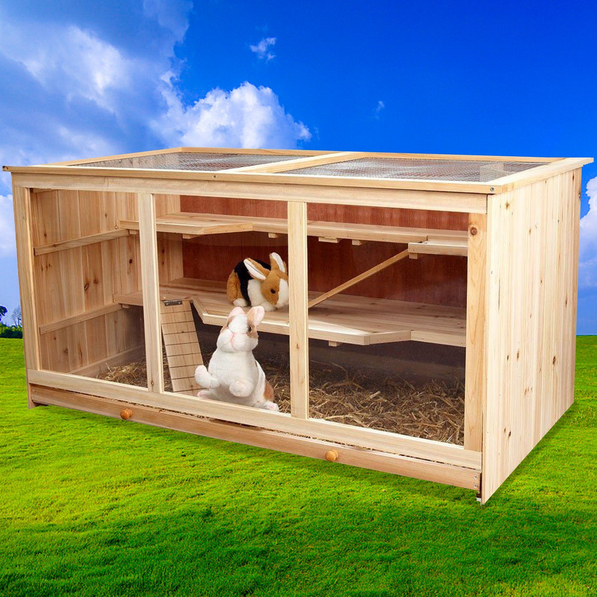 Dieser Kleintierstall ist ein wahres Schmuckstück. Die Vorderfront besteht aus hochwertigem Plexiglas im Holzrahmen, während der Deckel zusätzlich mit Drahtgeflecht versehen ist. Dank der Plexiglasfront können Sie Ihre Tiere jederzeit beobachten und sich an ihnen erfreuen. Eine Besonderheit des Käfigs sind die drei Stockwerke - hier haben die Tiere viel Platz zum Spielen, Toben und Kuscheln. Die Ebenen sind jeweils durch Holzstege miteinander verbunden. Für noch mehr Geborgenheit sorgt das kleine, integrierte Häuschen. Gleichzeitig begeistert der Nagerkäfig durch eine leichte Reinigung.