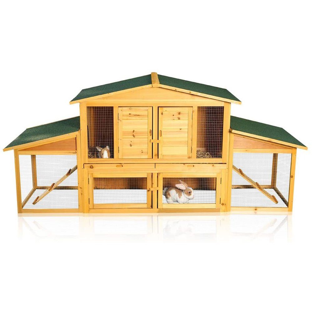 Der Stall ist aufgrund des speziellen Aufbaus von fast allen Seiten einsehbar. Der sichtgeschützte Bereich bietet einen Rückzugsort für Ihren Liebling, in dem er sich jederzeit verbergen kann. Die zwei Etagen können mit den mitgelieferten Holzrampen verbunden werden. Die beiden einzeln herausnehmbaren Schubladen erleichtern die Reinigung. Der untere Boden ist offen, sodass die Tiere auch direkten Bodenkontakt haben können.
