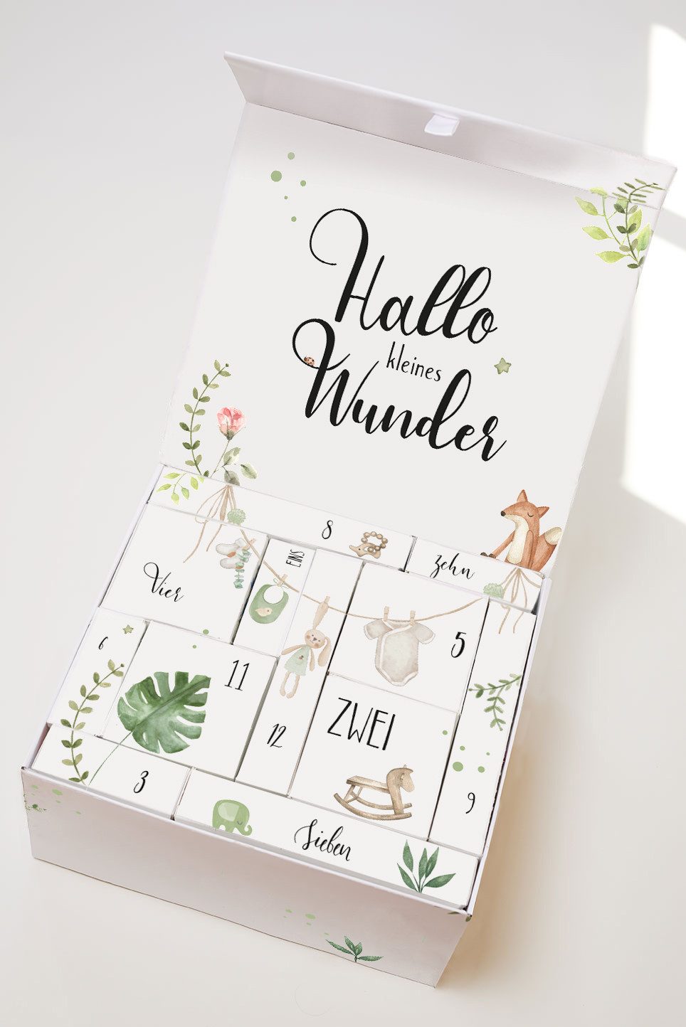 Der Baby Countdown Kalender begleitet frischgebackene Eltern durch das erste Lebensjahr ihres Kindes – mit 12 liebevoll gestalteten Überraschungen. Für jeden Monat wartet ein kleines Geschenk, das auf die jeweilige Entwicklungsphase abgestimmt ist und Eltern emotional durch diese besondere Zeit führt. Jedes der 12 Monatsgeschenke enthält kreative Impulse, Erinnerungen oder Anregungen, die den Familienalltag bereichern. Durch das hochwertige Design wird der Kalender auch zu einem besonderen Blickfang im Kinderzimmer. Optional kann der Kalender mit dem Namen des Babys personalisiert werden – ein sehr persönliches und hochwertiges Geschenk zur Geburt, Taufe oder Babyparty.