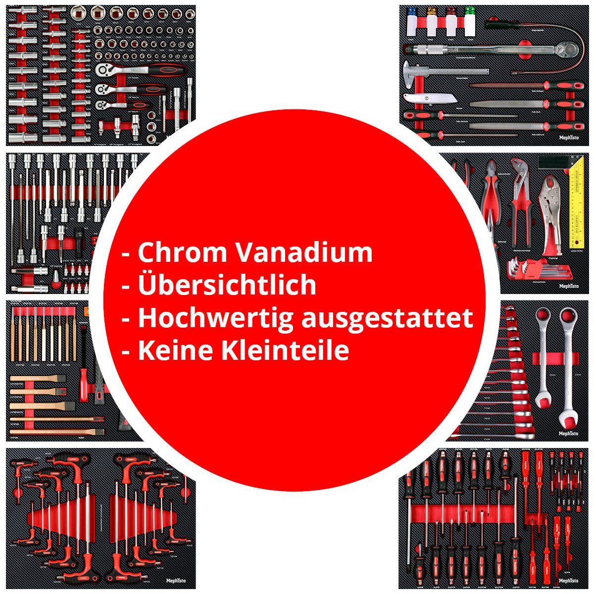Ein Merkmal, welches unseren Werkzeugwagen zu einem absoluten Top-Produkt in Bezug auf das Preis-Leistungsverhältnis macht, ist die Verwendung von Chrom-Vanadium-Stahl für unsere Werkzeuge. Zu beachten ist, dass es sich bei einer Reihe der günstigeren oder auch gleichpreisigen bzw. auch teureren Werkzeugwagen um keinen Chrom-Vanadium-Stahl handelt. Hier wird oft für das Werkzeug die deutlich günstigere und auch in ihren Eigenschaften, deutlich schlechtere Варианты mit unlegiertem Stahl / Kohlenstoffstahl verwendet.