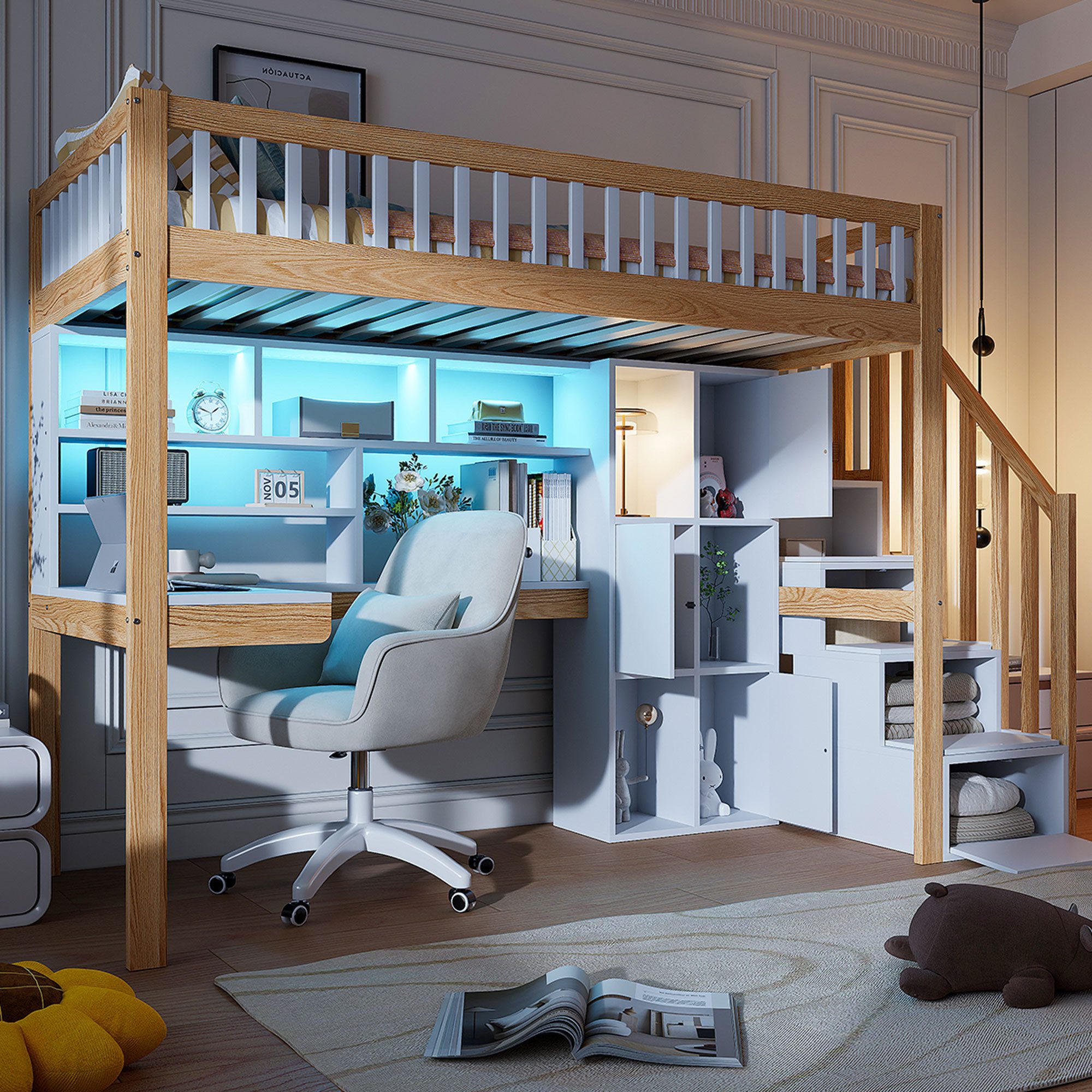 Das Merax Hochbett vereint zeitloses Design mit funktionalem Komfort. Aus stabilem Kiefernholz und MDF gefertigt, bringt es natürliche Wärme und hochwertige Verarbeitung in Ihr Zuhause. Die integrierte LED-Beleuchtung schafft ein sanftes, romantisches Lichtambiente, während die clevere Stauraumleiter, Regale und Ablagefächer Ordnung garantieren. Mit dem integrierten Schreibtisch wird es zum perfekten Multifunktionsmöbel für Kinder- und Jugendzimmer.