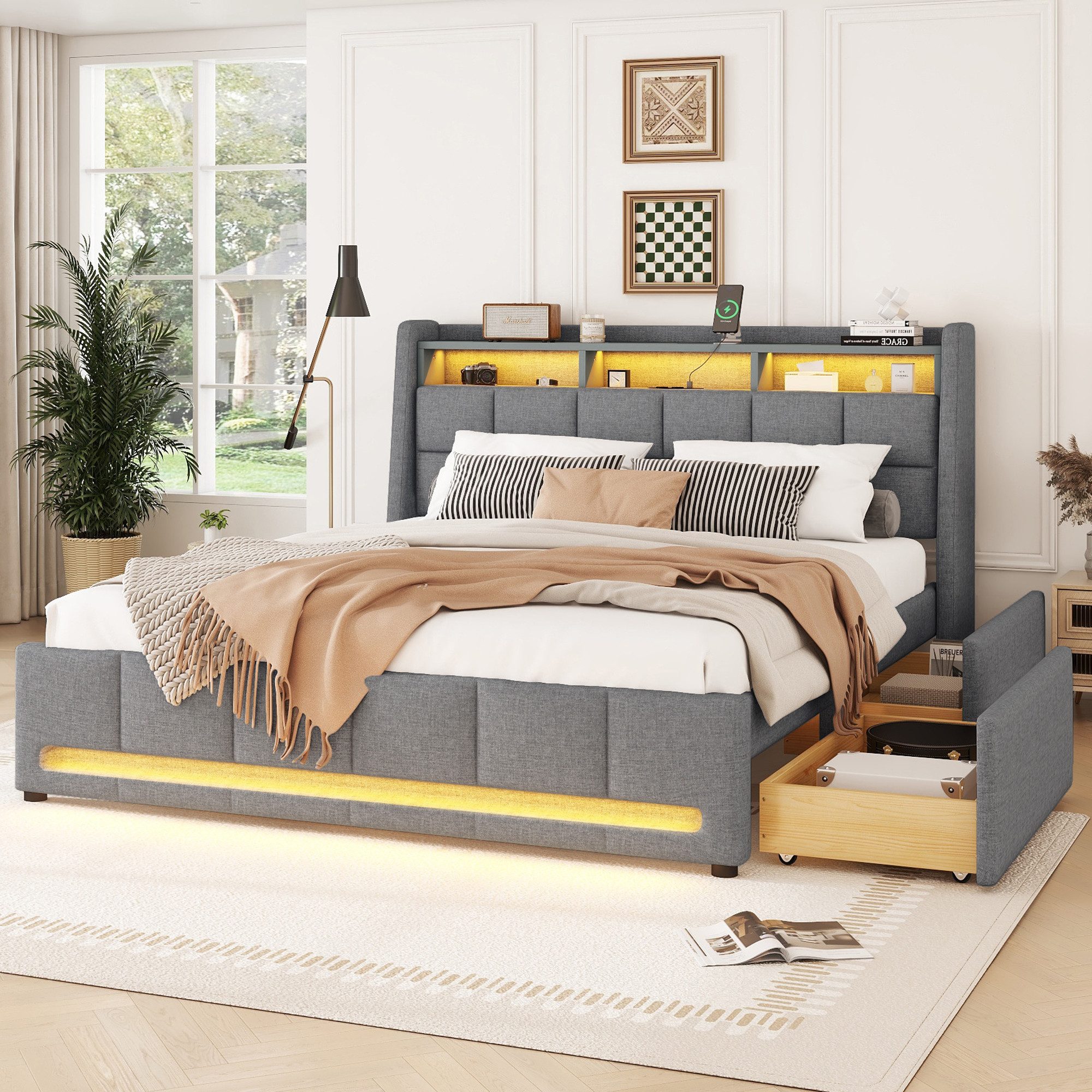 Dieses stilvolle Polsterbett bietet alles, was Sie für einen komfortablen und praktischen Schlafbereich benötigen. Der hochwertige Leinenbezug und die robuste MDF-Konstruktion sorgen für Langlebigkeit und ein gemütliches Gefühl. Mit integriertem LED-Ambiente-Licht, das per APP in verschiedenen Farben gesteuert werden kann, schaffen Sie die perfekte Stimmung im Schlafzimmer. Zusätzliche Schubladen und ein eingebautes Staufach bieten praktischen Platz für Ihre Sachen, während der USB-Anschluss und die Steckdosen im Kopfteil bequemes Laden von Geräten ermöglichen. Ideal für alle, die modernes Design und Funktionalität vereinen möchten!