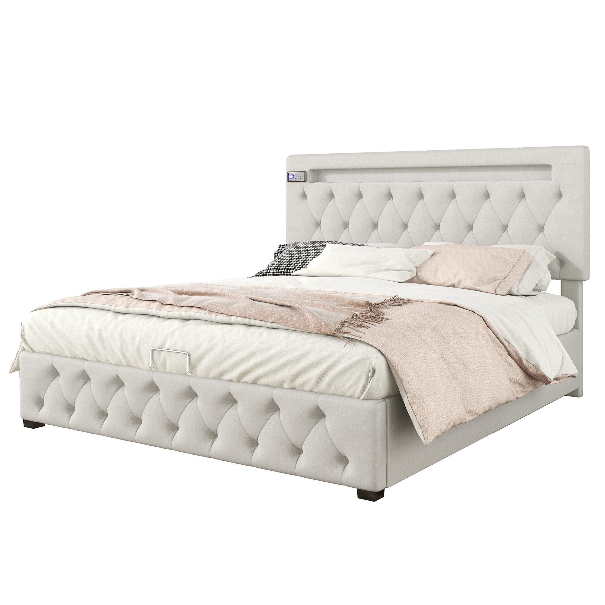 Gepolstertes höhenverstellbares Kopfteil mit Knopfheftung, inklusive farbwechselnder LED-Lichtleiste für stimmungsvolle Beleuchtung