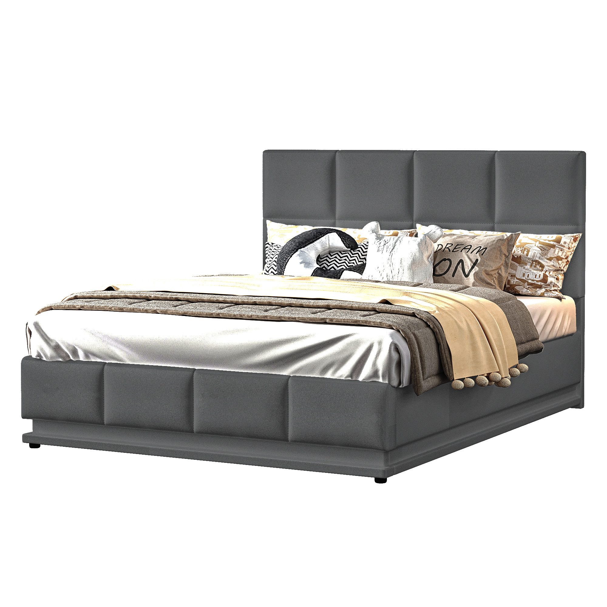Dieses Aufbewahrungsbett verfügt über einen einfach zu bedienenden hydraulischen Doppelhubmechanismus und besteht aus guten Ledermaterialien, einschließlich eines stabilen mittleren Stützbalkens und eines gepolsterten Rahmens.