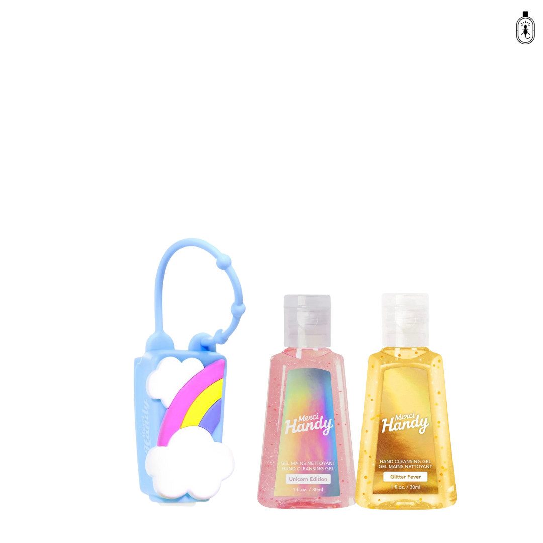 Mit diesem zauberhaften Set hast du deine Lieblings-Handreinigungsgels von Merci Handy immer griffbereit! Es enthält zwei Handreinigungsgels (je 30 ml) in den magischen Duftrichtungen Unicorn und Glitter Fever sowie einen passenden Unicorn-Handgel-Halter für unterwegs. Merci Handy Handreinigungsgel – Unicorn (30 ml) Ein Hauch von Magie für deine Hände! Der sanfte, duftende Reinigungsgel verleiht dir Frische und Sauberkeit – ganz ohne Wasser. Merci Handy Handreinigungsgel – Glitter Fever (30 ml) Funkelnde Pflege für deine Hände! Mit feinem Glitzer und einem verführerischen Duft sorgt dieses Gel für saubere und gepflegte Hände in Sekundenschnelle. Passender Unicorn-Handgel-Halter Stylisch, praktisch und immer dabei! Der süße Silikonhalter in Einhorn-Optik lässt sich einfach an Taschen, Rucksäcken oder Schlüsseln befestigen – so hast du dein Handgel jederzeit zur Hand. Perfekt für unterwegs, als Geschenk oder einfach, um dir selbst eine kleine Freude zu machen!