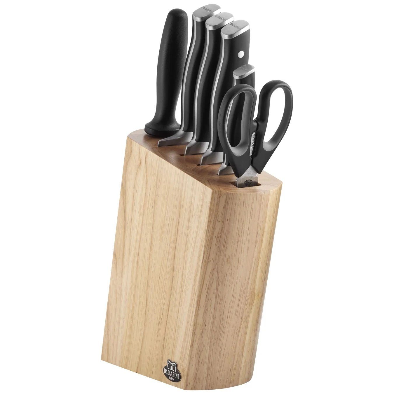 BALLARINI Savuto Messerblockset 7-tlg, Natur Beschreibung Mit BALLARINI kommt das italienische Lebensgefühl auch in Ihr Zuhause. Mit dem 7-teiligen Messerblock Savuto Nero erhalten Sie ein qualitativ hochwertiges Messerset, das eine vollständige Grundausstattung für Ihre Küche bietet. Das Set besteht aus einem Spick- und Garniermesser zum Putzen von Gemüse und Schälen von Obst, einem Kochmesser, das für die meisten Tätigkeiten in der Küche geeignet ist. Vom Zerkleinern von Gemüse und Fleisch bis zum Hacken von Kräutern ist dieses Messer ein wahrer Всеskönner. Hinzu kommt ein Brotmesser, mit dem sich saubere Scheiben schneiden lassen. Ergänzt wird das Set durch ein Fleischmesser, bestens geeignet zum Verarbeiten von Fleisch jeglicher Art. Der Wetzstahl dient dazu die Schärfe der Messer zu erhalten. Abgerundet wird das Set durch eine Vielzweckschere. Die Küchenmesser der Serie Savuto Nero sind aus hochwertigem deutschen Edelstahl gefertigt. Sie sind rostfrei, sehr scharf und robust. Die ergonomischen Griffe sorgen dafür, dass die Messer gut in der Hand liegen und der Handschutz verhindert Verletzungen. Das Messerset ist spülmaschinengeeignet, jedoch wird eine schonende Reinigung von Hand empfohlen, da aggressive Reinigungsmittel den Messern langfristig schaden können. Der Messerblock ist aus Holz gefertigt und braun lackiert. Er schützt Ihre Messer vor Beschädigungen und bietet eine elegante Aufbewahrungsmöglichkeit. Ermüdungsfreies Arbeiten durch ergonomischen Griff Anspruchsvolles Design Hohe Schärfe- und Schnitthaltigkeit Sehr gute Korrosionsbeständigkeit Fingerschutz für mehr Sicherheit Aus deutschem, rostfreiem Stahl Enthält 1 Spick- und Garniermesser (9 cm), 1 Fleischmesser (16 cm), 1 Kochmesser (20 cm), 1 Brotmesser (20 cm), 1 Vielzweckschere, 1 Wetzstahl, 1 Block Eigenschaften Farbe: Natur Material: Edelstahl Herstellungsart: geschweißt Anzahl Schlitze: 6 Lieferumfang: 7 Grifffarbe: Schwarz Griffmaterial: Kunststoff Abmessungen Gewicht netto: 3,25 kg Produktlänge: 42,20 cm Produktbreite: 28,60 cm Produkthöhe: 10,60 cm