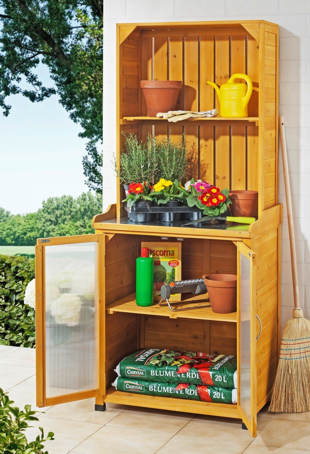 Der Gartenschrank mit Regalaufsatz ist die ideale Ergänzung für Ihre Terrasse, Balkon, Kleingartenanlage oder Ihren Garten. Die verzinkte Arbeitsfläche aus Metall und das wasserabweisende, imprägnierte und witterungsbeständige Holz sorgen für Langlebigkeit und Robustheit.