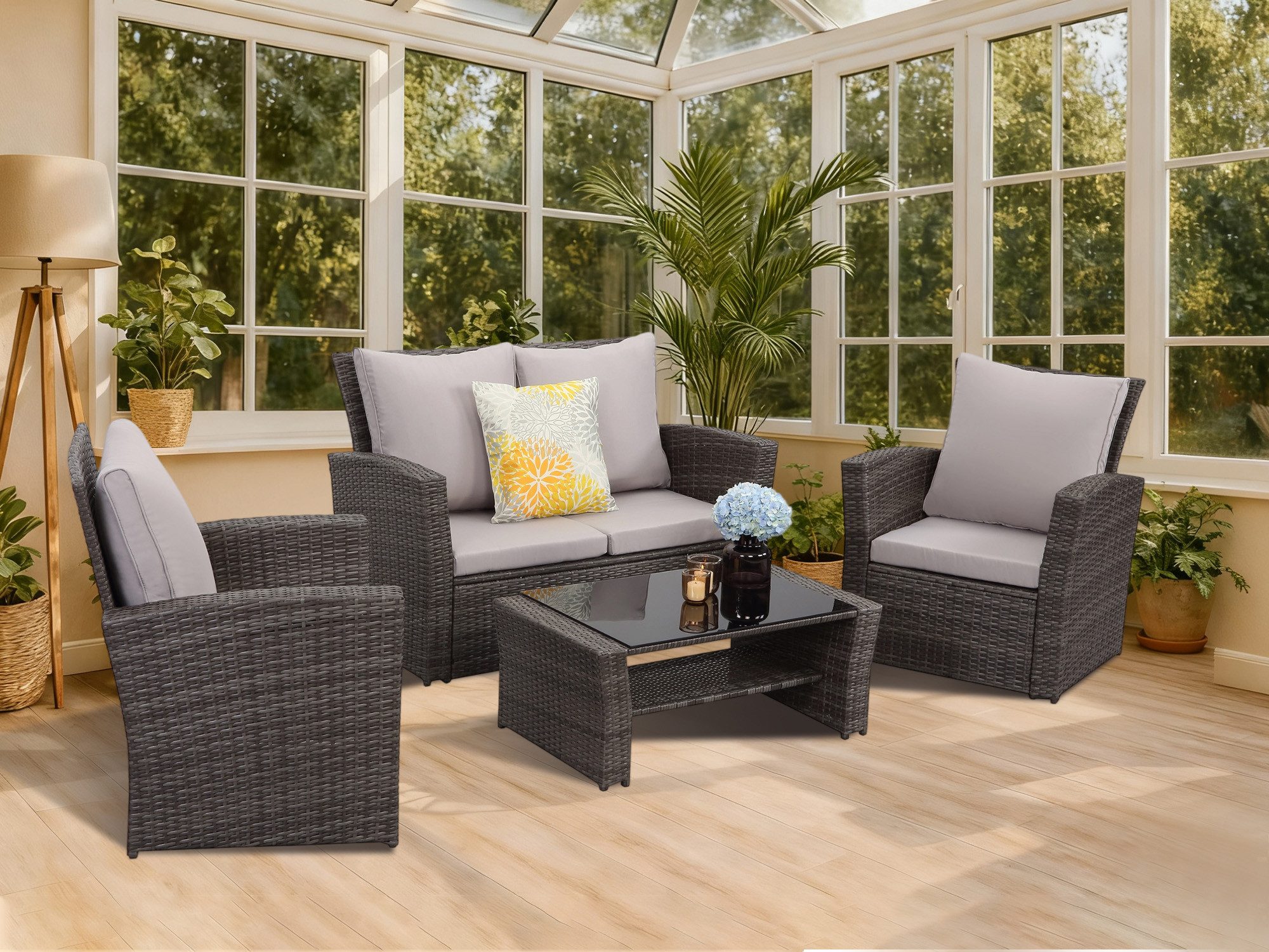 Set beinhaltet | 1 x 2-Sitzer Sofa, 2 x Sessel, 1 x Tisch, 4 x Sitzkissen, 4 x Rückenkissen, 1 x Bedienungsanleitung |