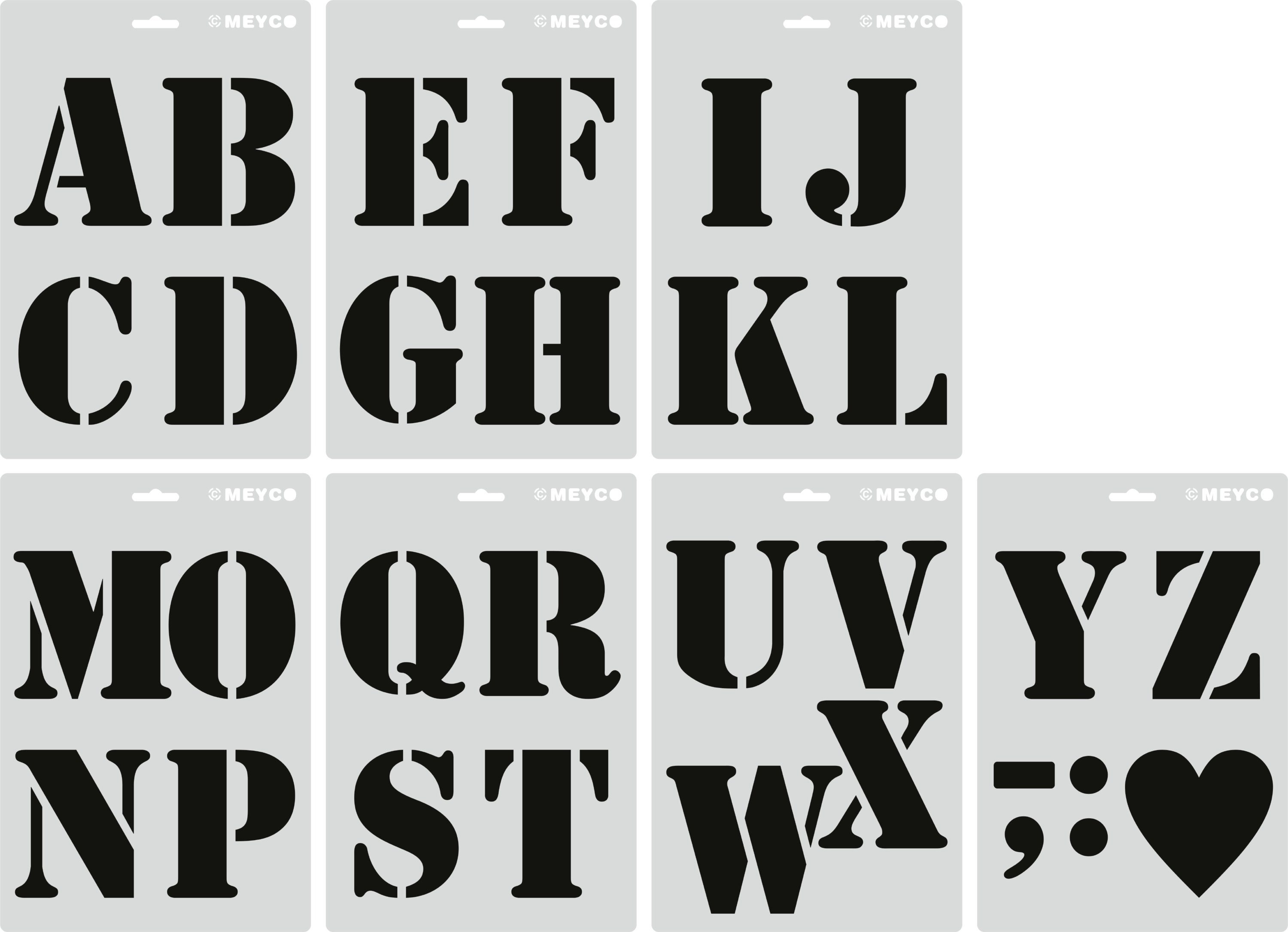 Schablonen-Set 'XL Buchstaben' mit ca. 10 cm großen Buchstaben und Sonderzeichen. Es sind 7 transparente Schablonen mit einer Размер von ca. 21 x 31 cm enthalten. Perfekt zum Gestalten verschiedener Oberflächen mit persönlichem Namen oder einer Botschaft. Toll für Keilrahmen, große Boxen oder auch Möbelstücke. Die passende Farbe mit einem Pinsel, einer Rolle oder einem Schwamm auftragen. Fixieren Sie die Schablonen am besten mit Schablonenhaftkleber oder Spray. So wird ein Verrutschen verhindert.