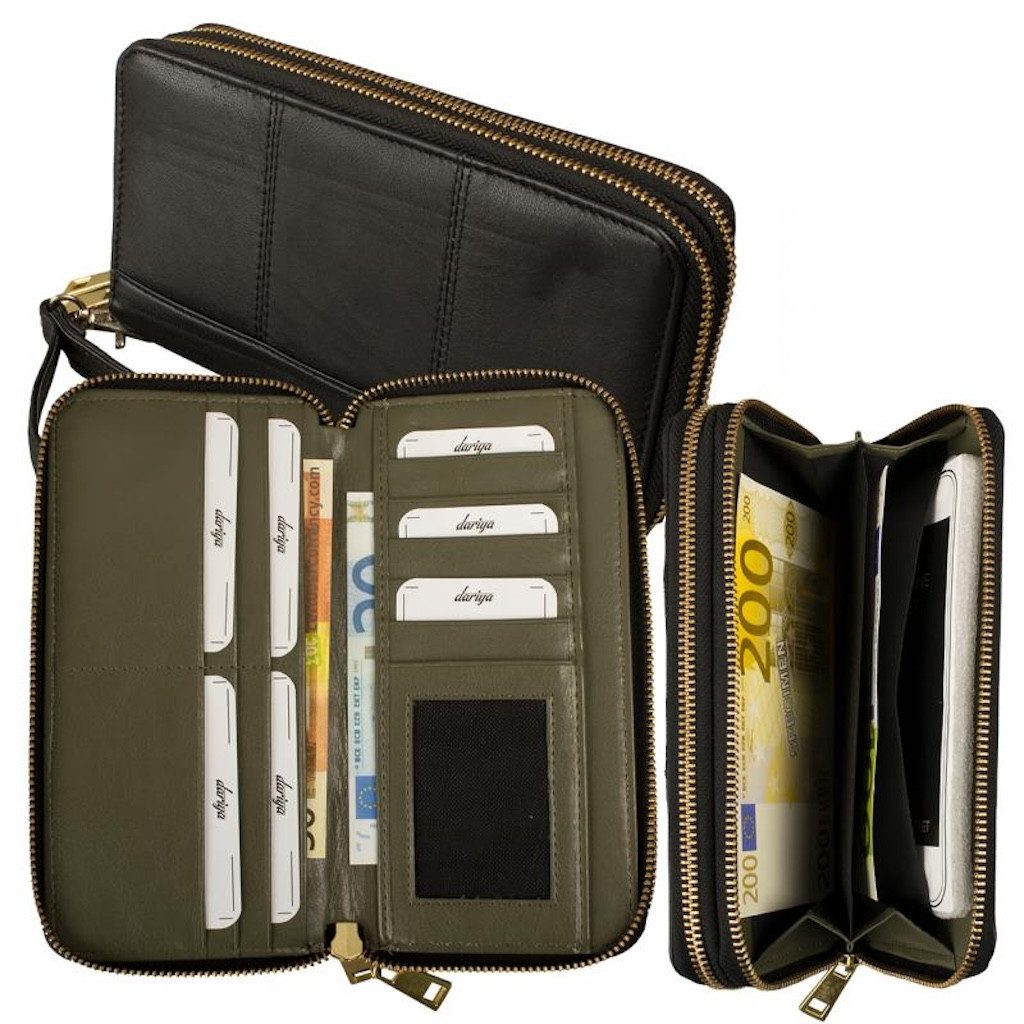 Diese edle Damenbörse aus Lamm Nappa Leder kombiniert stilvolles Design mit praktischer Funktionalität. Die elegante schwarze Außenfarbe wird im Inneren durch ein auffälliges Blau oder Olive ergänzt, was der Geldbörse eine besondere Note verleiht. Dank zwei umlaufender Reißverschlüsse ist der Inhalt stets sicher verstaut. Das durchdachte Innenleben bietet 11 Kartenfächer, ein Sichtfensterfach, drei zusätzliche Einsteckfächer für Dokumente oder Quittungen, zwei große Scheinfächer sowie ein separates Smartphonefach. Ein zusätzliches Hartgeldfach außen mit Reißverschluss sorgt für schnellen Zugriff auf Münzen. Die abnehmbare Handschlaufe ermöglicht bequemes Tragen und macht die Geldbörse zum idealen Begleiter für Alltag oder Reisen. Eigenschaften: Hochwertiges Material: Edles Lamm Nappa Leder mit farblich abgesetztem Innenbereich Optimale Fächeraufteilung: 11 Kartenfächer, 1 Sichtfensterfach, 3 Einsteckfächer, 2 Scheinfächer Sicher & praktisch: 2 Rundum-Reißverschlüsse für maximale Sicherheit Zusätzlicher Komfort: Separates Hartgeldfach außen mit Reißverschluss Vielseitig einsetzbar: Mit abnehmbarer Handschlaufe für bequemes Tragen Maße: Breite: ca. 20,0 cm Höhe: ca. 11,0 cm