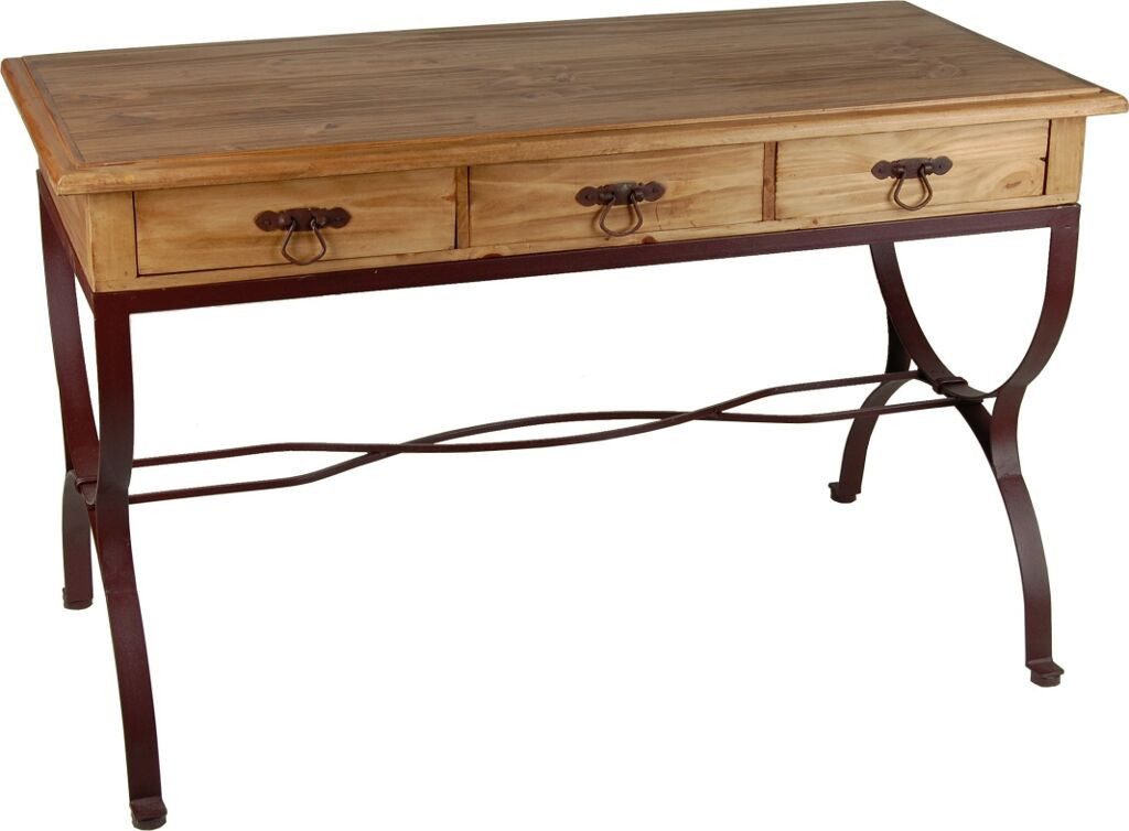 Stilvoller Schreibtisch im Landhausstil aus massiver Pinie, gewachst. Dieser Schreibtisch ist die perfekte Mischung aus Holz und Schmiedeeisen. Der obere Teil wurde aus massivem Pinienholz gefertigt und besteht aus einem Korpus mit drei Schubladen und einer Tischplatte. Das darunterlegende Tischgestell wurde komplett aus Eisen von Hand geschmiedet und anschließend rostpatiniert. Auch die Beschläge und Griffe wurden aus Schmiedeeisen gefertigt. Die Geschwungenen Tischbeine in X-Form lockern das Erscheinungsbild des Tisches auf und vermitteln eine Art verspielte Leichtigkeit. Gerade in kleinen Räumen oder Nischen wirkt der Tisch aufgrund seiner Form bei einer Размер von 128 x 62 cm dennoch grazil und eignet sich daher auch gut als Arbeitsplatz im Homeoffice. Mit diesem Schreibtisch erhalten Sie ein Stück mexikanischer Handwerkskunst, denn jeder Tisch wurde überwiegend von Hand gefertigt und ist somit ein Unikat. Kombinieren Sie diese Schreibtisch mit anderen Möbeln im klassischen oder modernen Landhausstil oder stellen Sie ihn als Solitärmöbel in eine sonst schlichte, geradlinige Einrichtung. Dieser Tisch wird überall die Blicke auf sich ziehen.