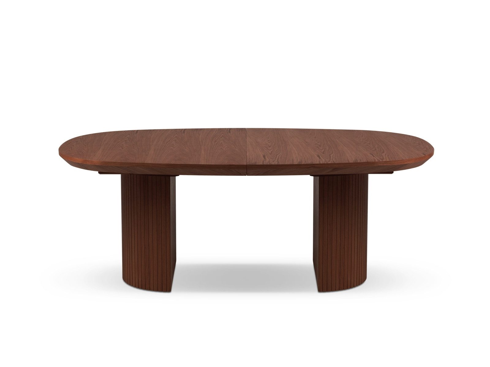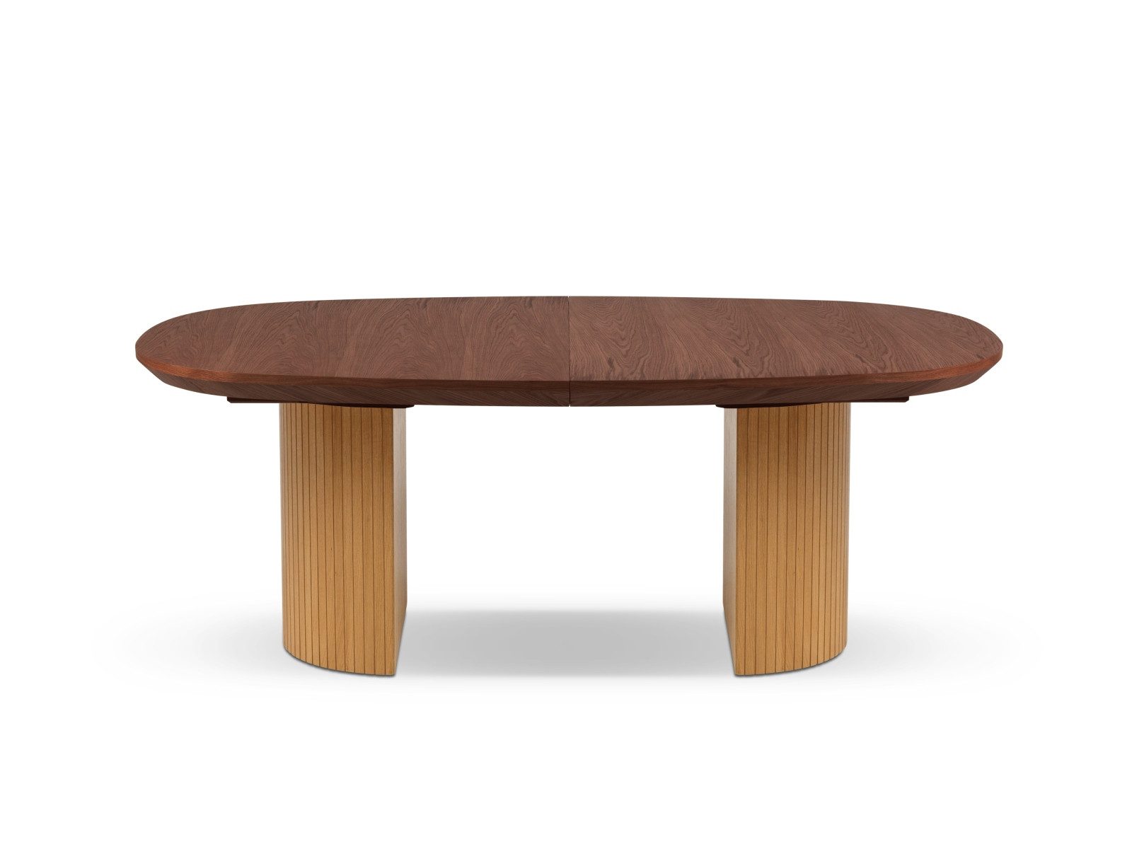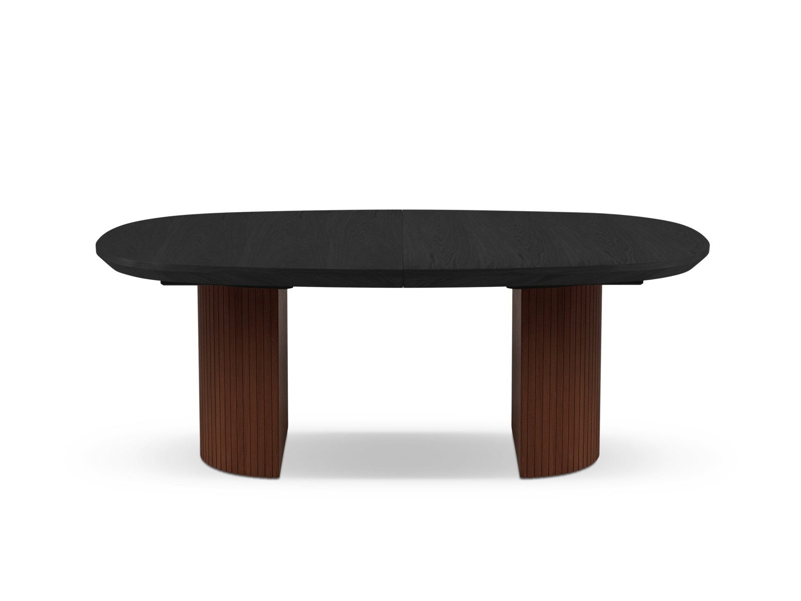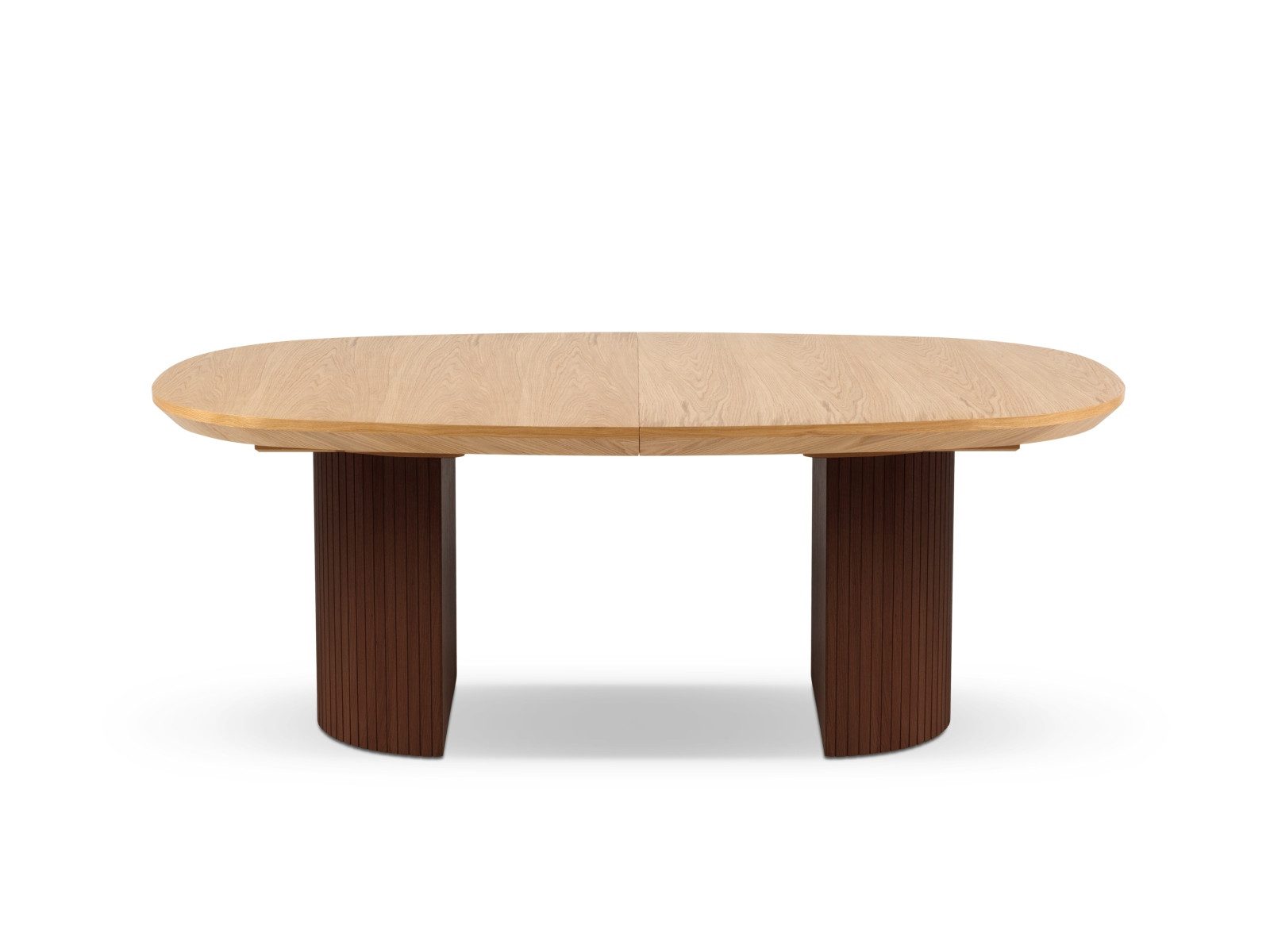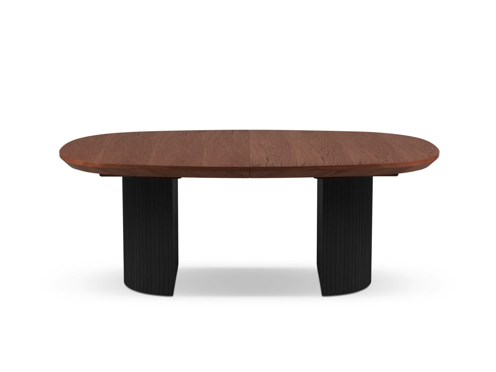 Mit seiner ovalen Tischplatte in warmer Holzoptik und den rund gerillten Tischbeinen in elegantem Schwarz ist der Nido optisch das Möbelstück, das man nicht übersehen kann – selbst wenn man wollte. Die Breite von 110 cm sorgt für reichlich Platz, auch für den Tischnachbarn mit ausschweifendem Ellenbogenstil.