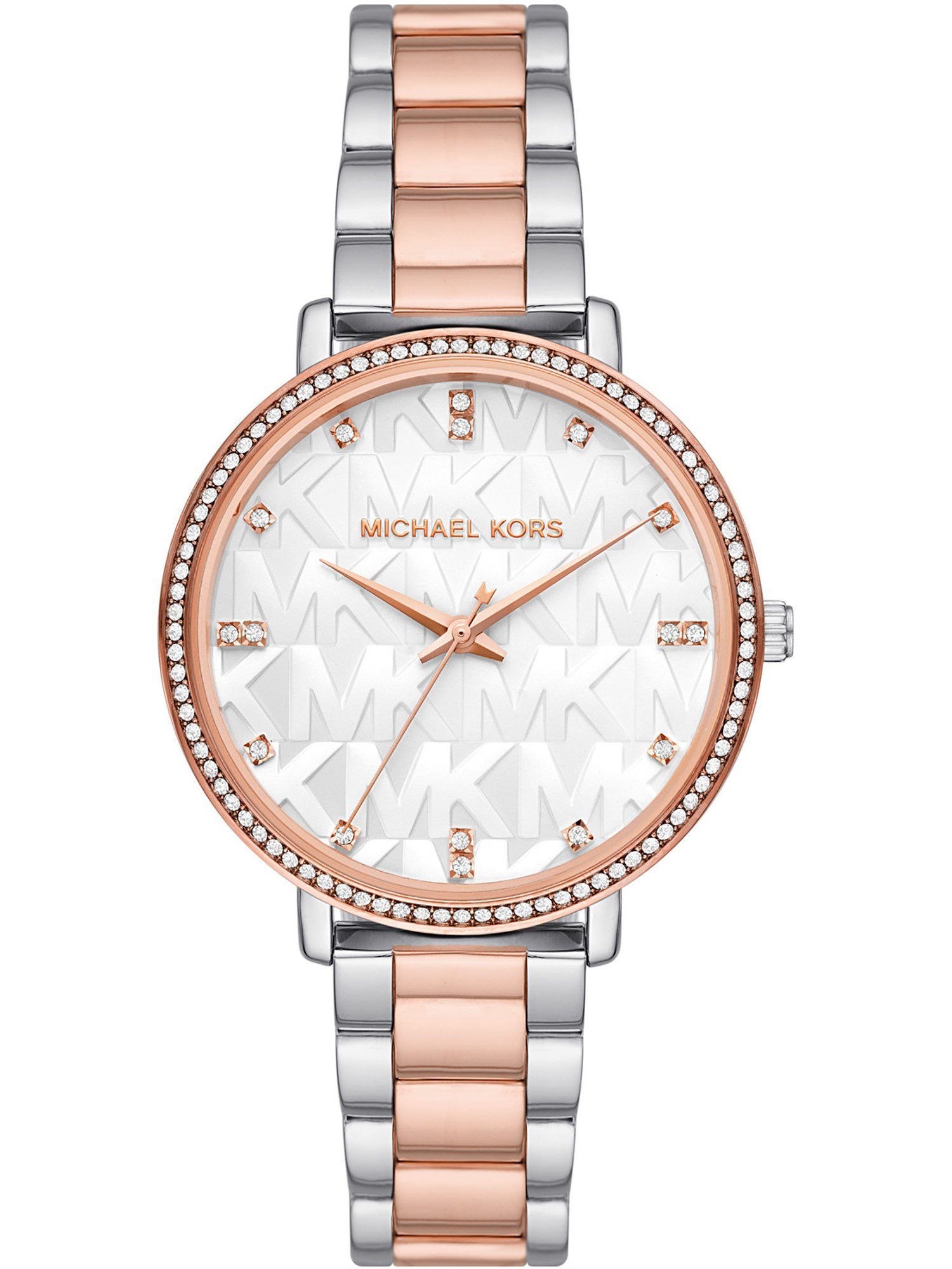 Trendige Designs, die frischen Wind in deinen Alltag bringen – dafür steht das Label Michael Kors. Der preisgekrönte, amerikanische Designer kreiert selbstbewusste Accessoires, die zeitlose Schönheit mit Modernität und einem Hauch Luxus verbinden. Diese Damenuhr mit Metall-Gehäuse an einem klassischen Metall-Armband ist dank des sportlich-eleganten Designs der perfekte Begleiter für jeden Anlass. Die Michael Kors Pyper kommt in Bicolor daher, das weiße Ziffernblatt setzt dazu einen tollen Akzent. Passt an schmale Handgelenke ebenso gut wie an breitere: Das runde Gehäuse mit 38 mm Durchmesser ist ein echter Allrounder. Durch das Quarzwerk ist eine hohe Präzision gewährleistet. Ein Mineralglas bietet eine klare Sicht auf das Ziffernblatt und guten Schutz gegen alle Einflüsse, die bei normalem Gebrauch entstehen. Spritzwasser und Regen machen diesem Zeitmesser nichts aus: Er ist bis zu 3 Bar wasserdicht. Mit der Kipp-Faltschließe lässt sich das Armband leicht anlegen und sicher verschließen. Wer seinem Look eine stilvolle Note verleihen möchte, macht mit der Michael Kors Pyper Damenuhr definitiv alles richtig!
